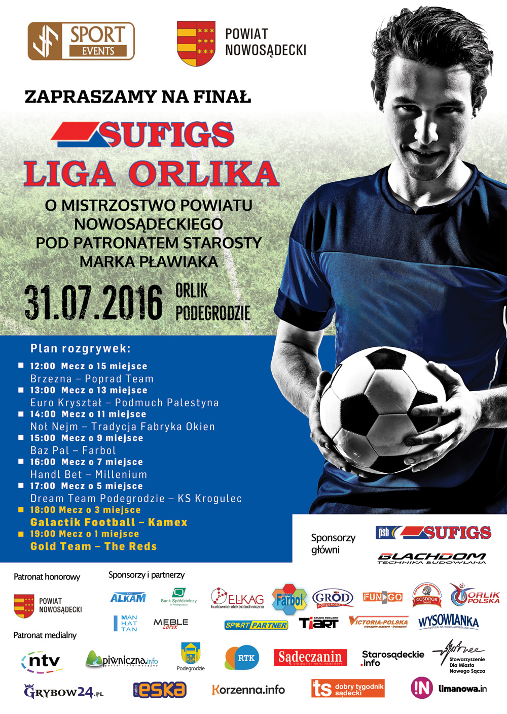 Już w najbliższą niedzielę tj. 31.07.2016 roku rozegramy Wielki Finał SUFIGS Ligi Orlika o Mistrzostwo Powiatu Nowosądeckiego pod patronatem Starosty Marka Pławiaka. Zaczynamy o godzinie 12:00 na Orliku w Podegrodziu. Same rozgrywki potrwają aż do godziny 20:00, gdzie po tym czasie poznamy Mistrza Powiatu Nowosądeckiego. Przez cały dzień będzie Piknikowa atmosfera w rytmach najrozmaitszej muzyki. […]