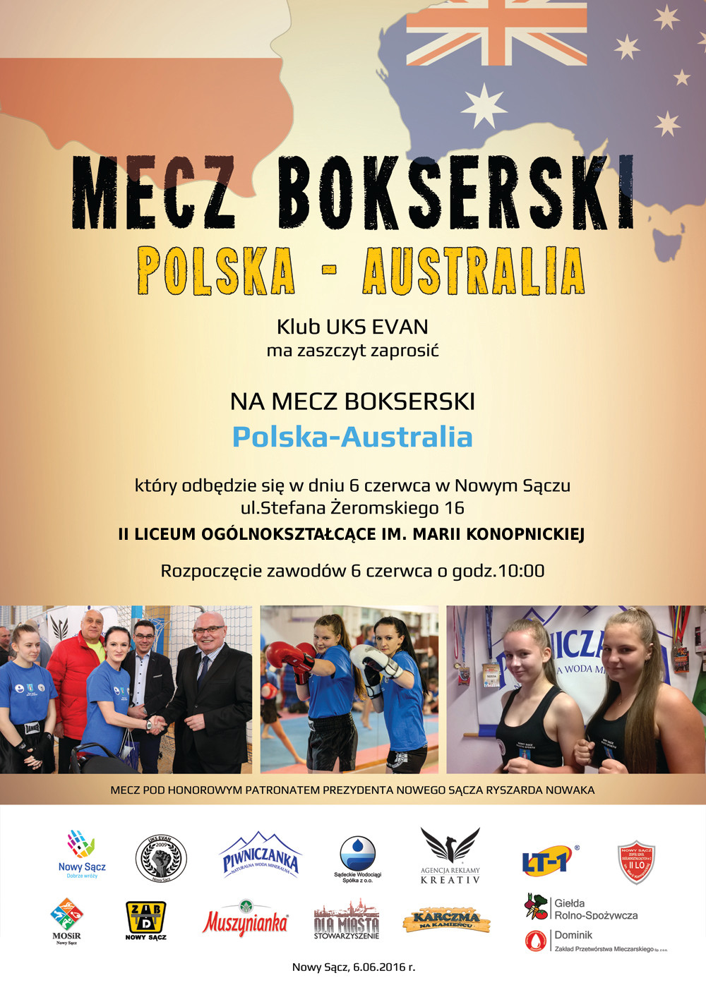 Pod honorowym patronatem Prezydenta Miasta Nowego Sącza Ryszarda Nowaka odbędzie się mecz bokserski Polska-Australia. Zawody rozpoczną się o godz. 10:00 w II Liceum Ogólnokształcącym im. Marii Konopnickiej w Nowym Sączu. Organizatorem zawodów jest Uczniowski Klub Sportowy Evan. – To będzie rywalizacja pełna emocji, która dodatkowo pokaże młodzieży, że można reprezentować wysoki poziom sportowy i osiągać […]