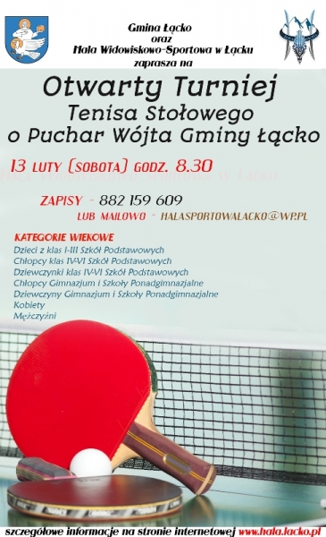 Wójt Gminy Łącko zaprasza wszystkich miłośników tenisa stołowego do wzięcia udziału w Otwartym Turnieju Tenisa Stołowego, który rozgrany zostanie 13 lutego 2016 r. na Hali Widowiskowo-Sportowej w Łącku.