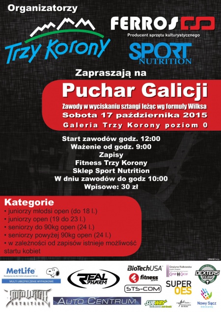 W sobotę 17 października w Galerii Trzy Korony odbędzie się I Puchar Galicji w konkurencji wyciskania sztangi leżąc. Główna nagroda to Puchar Prezydenta Miasta Nowego Sącza. Rywalizacja będzie odbywać się w kilku kategoriach: juniorzy młodsi open (do 18 lat), juniorzy open (19-23 lat), seniorzy do 90 kg open, seniorzy powyżej 90 kg open. Organizatorzy czekają […]