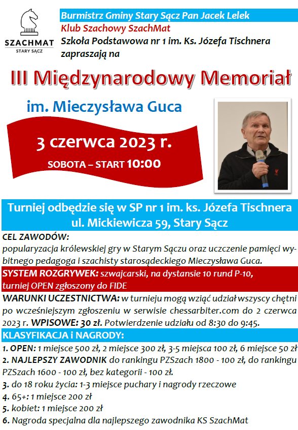 3 czerwca 2023 w Szkole Podstawowej nr 1 przy ulicy Mickiewicza 59 w Starym Sączu odbędzie się III Międzynarodowy Turniej Szachowy im. śp Mieczysława Guca, mistrza szachowego, który zmarł nagle 11 maja 2021 roku. Zapraszamy do zapisów. Szczegóły na plakacie. Czytaj także: Zmarł Mieczysław Guc, emerytowany nauczyciel i mistrz szachowy