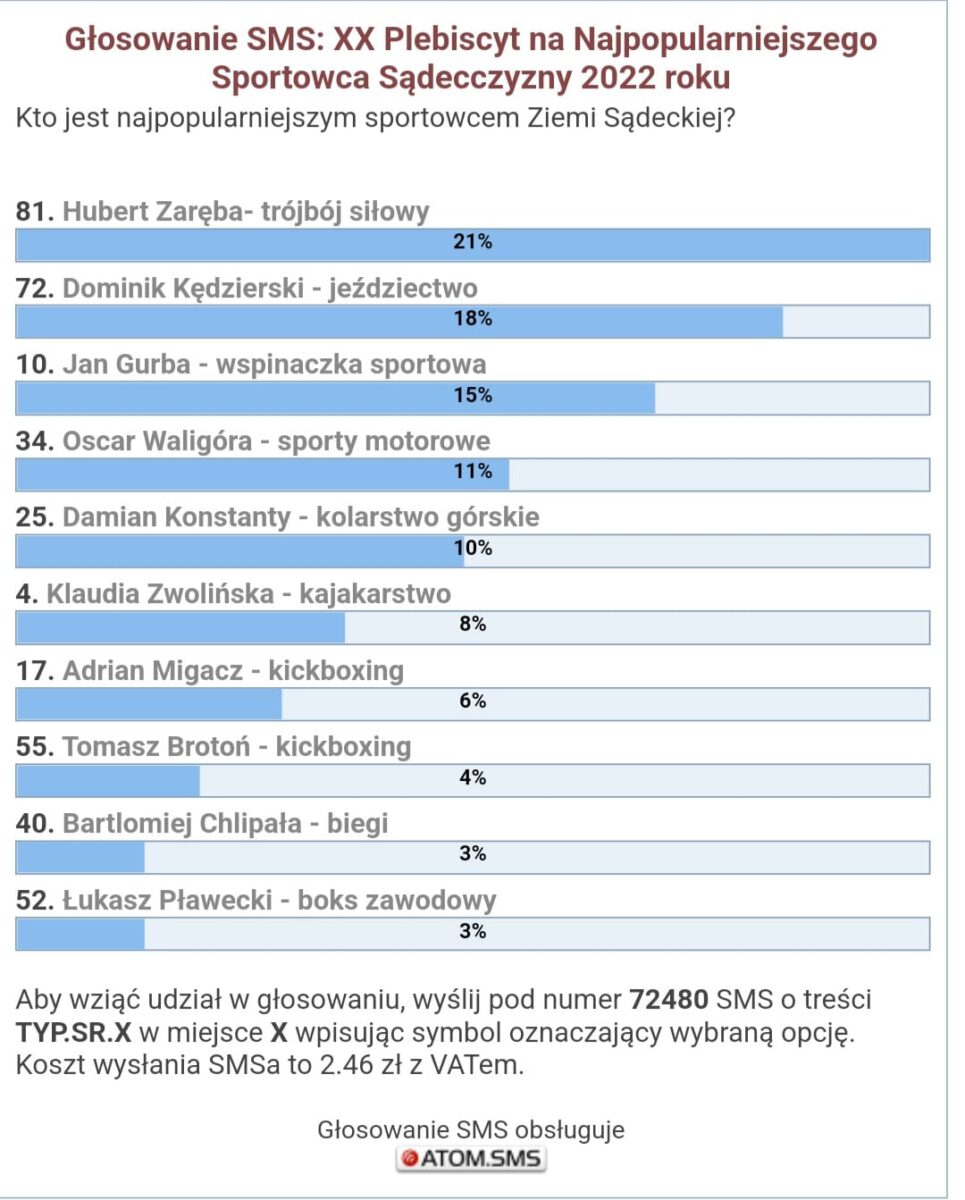 Znamy już finalistów XX edycji Plebiscytu na Najpopularniejszego Sportowca Sądecczyzny 2022 roku! Gratulujemy! Głosowanie trwa Głosowanie trwa do 16 lutego. Spośród 10 finalistów wybierzemy tego najpopularniejszego. Wśród finalistów są: Hubert Zaręba, Dominik Kędzierski, Jan Gurba, Oskar Waligóra, Damian Konstanty, Klaudia Zwolińska, Adrian Migacz, Tomasz Brotoń, Bartłomiej Chlipała oraz Łukasz Pławecki. Każdy ze sportowców ma przyporządkowany inny numer wg wzoru:numer […]