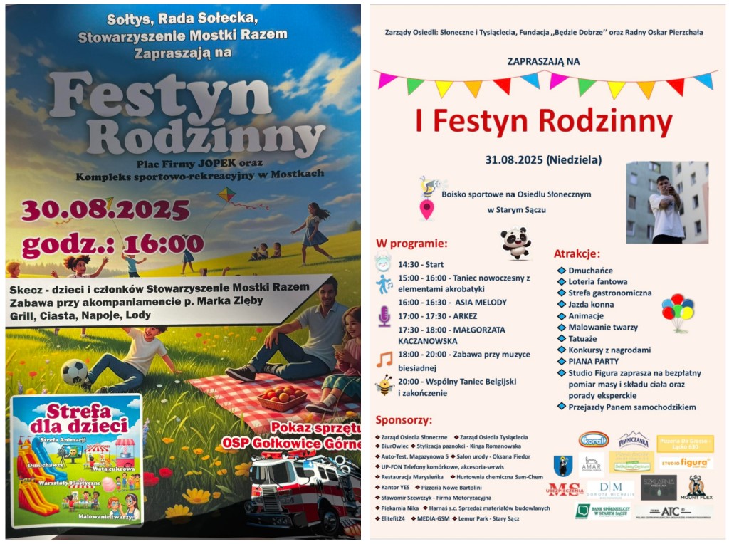 Przed nami wyjątkowe wydarzenia na zakończenie wakacji Sobota, 30 sierpnia – Mostki Stowarzyszenie „Mostki Razem” zaprasza na rodzinny festyn pełen atrakcji dla dzieci i dorosłych. Niedziela, 31 sierpnia – Osiedle Słoneczne Na boisku sportowym odbędzie się I Festyn Rodzinny – idealna okazja do wspólnego świętowania końca lata z muzyką, konkursami i niespodziankami. Do zobaczenia!