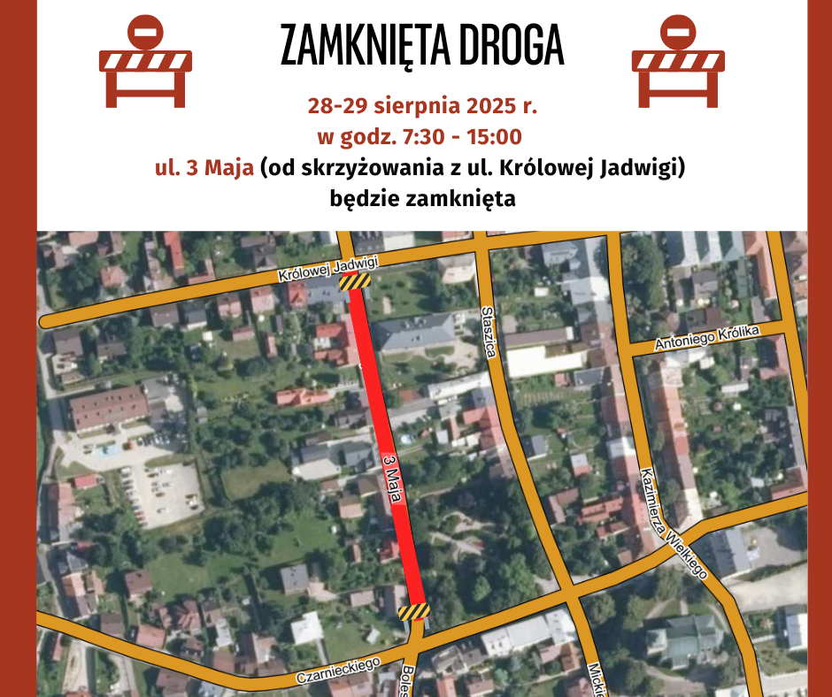 Urząd Miejski w Starym Sączu informuje, że w dniach 28–29 sierpnia 2025 r., w godzinach 7:30–15:00, nastąpi czasowe zamknięcie ulicy 3 Maja – na odcinku od skrzyżowania z ul. Królowej Jadwigi. Utrudnienia są spowodowane zaplanowanymi pracami porządkowymi prowadzonymi na wskazanym fragmencie drogi. W tym czasie ruch kołowy nie będzie możliwy, dlatego kierowcy proszeni są o […]