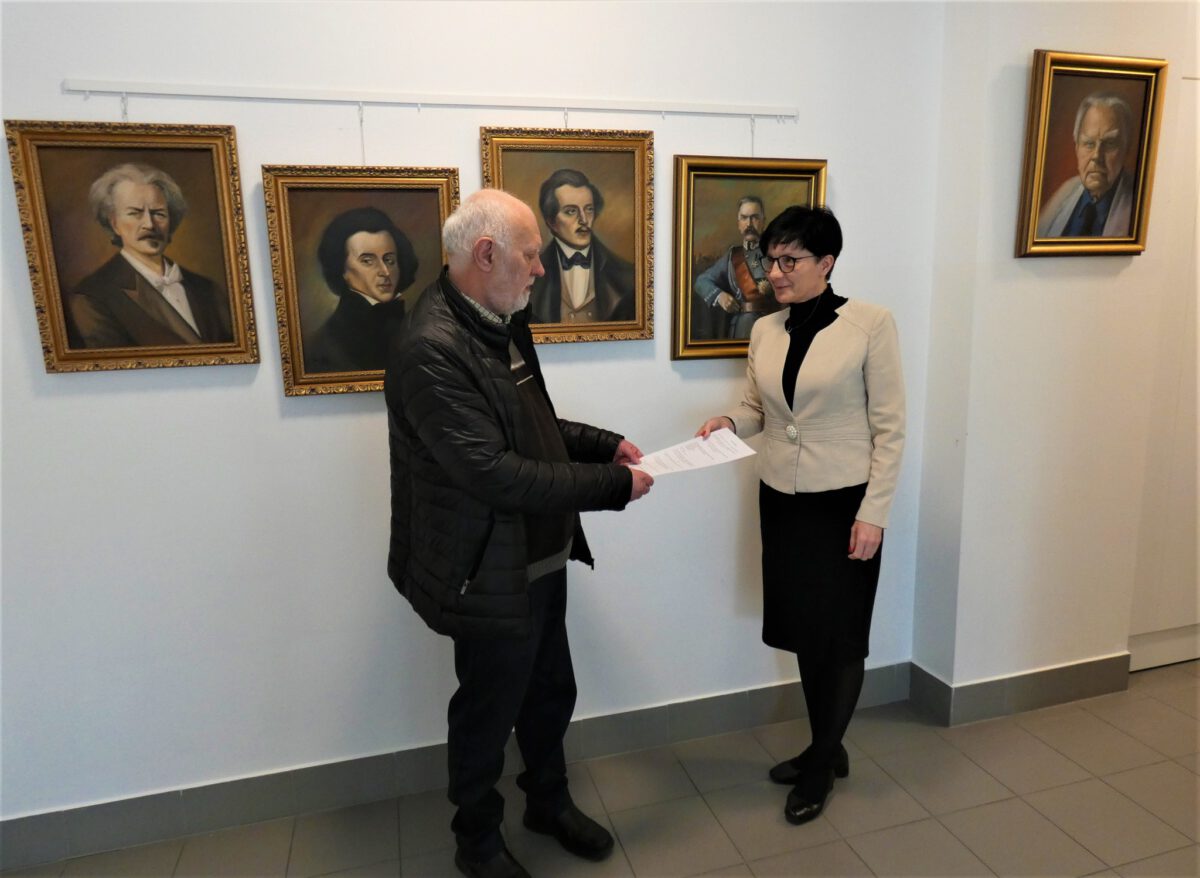 Pan Andrzej Długosz kustosz Muzeum Regionalnego im. Seweryna Udzieli, prezes Towarzystwa Miłośników Starego Sącza podarował Powiatowej i Miejsko-Gminnej Bibliotece Publicznej w Starym Sączu ze swojej prywatnej kolekcji pięć obrazów olejnych na płótnie autorstwa Damiana Gierlacha. Są to portrety Wielkich Polaków: Józefa Piłsudskiego, Fryderyka Chopina, Ignacego Jana Paderewskiego, Juliusza Słowackiego i Czesława Miłosza.