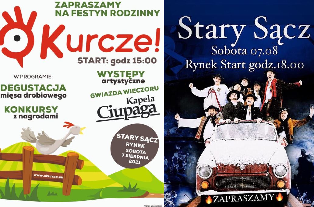 Już dzisiaj (7 sierpnia) na starosądeckim Rynku odbędzie się festyn rodzinny zorganizowany przez Polski Związek Zrzeszeń Hodowców i Producentów Drobiu. Na finał zagra kapela CIUPAGA. PROGRAM:15:00 Oficjalne otwarcie imprezy15:30 Koncert Kapeli Góralski Przystanek16:30 Konkursy z nagrodami16:45 Muzyka na żywo17:15 Koncert Zespołu „Kameneon”18:15 Koncert Zespołu „Kapela Ciupaga”19:30 Zakończenie festynu