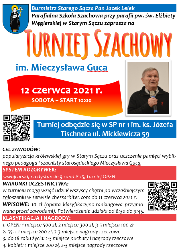 12 czerwca w Szkole Podstawowej nr 1 przy ulicy Mickiewicza 59 w Starym Sączu odbędzie się I Turniej Szachowy im. śp Mieczysława Guca, mistrza szachowego, który zmarł nagle 11 maja tego roku. Organizatorem turnieju jest Gmina Stary Sącz i Parafialna Szkoła Szachowa przy Parafii św. Elżbiety w Starym Sączu. Zapraszamy do zapisów. Szczegóły na plakacie. […]