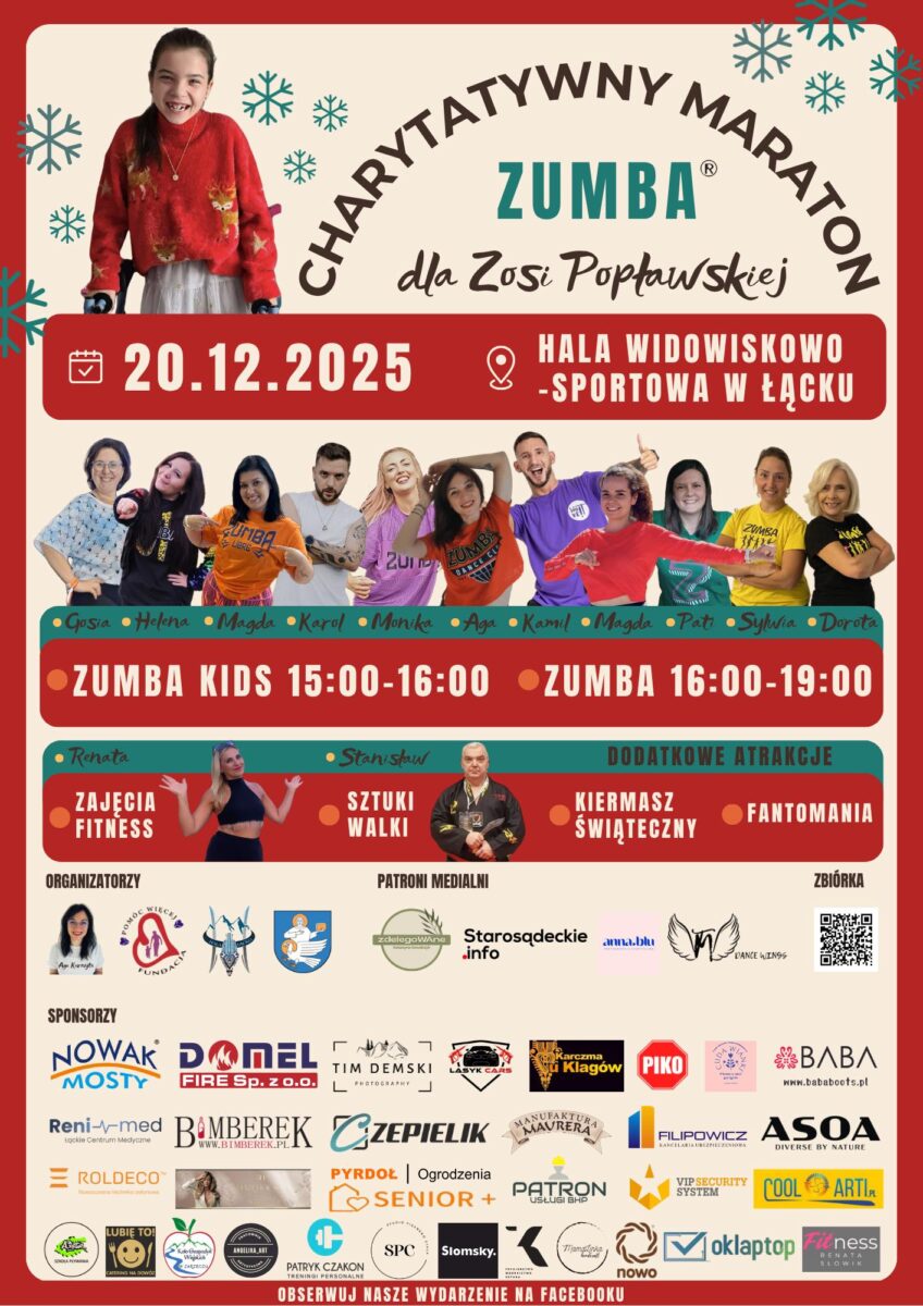 Już 20 grudnia w hali sportowej w Łącku odbędzie się wyjątkowe wydarzenie – Charytatywny Maraton Zumby dla Zosi Popławskiej. To piękna inicjatywa, której celem jest wsparcie dzielnej dziewczynki w walce o samodzielność i lepsze jutro. Zosia przyszła na świat 7 czerwca 2015 roku jako wcześniak urodzony w 30. tygodniu ciąży. Od pierwszych dni życia zmagała […]