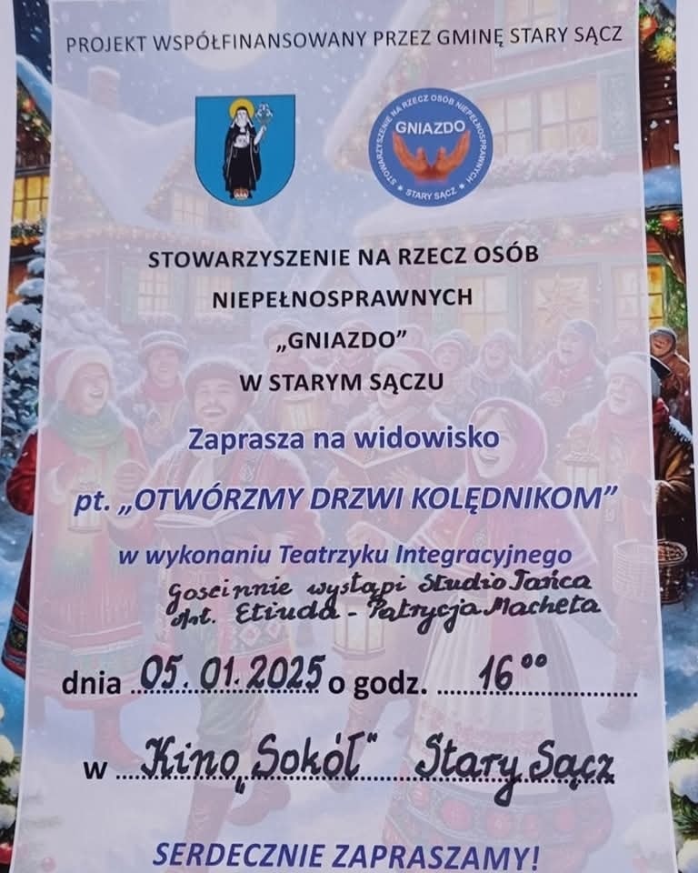 W piątkowy wieczór, 5 stycznia 2025 roku, w pełnej sali kina Sokoł w Starym Sączu odbyło się niezwykłe wydarzenie. Podopieczni Stowarzyszenia na rzecz Osób Niepełnosprawnych „Gniazdo”, wraz z przyjaciółmi, uczniami Szkoły Podstawowej nr 2 oraz Liceum Ogólnokształcącego im. Marii Skłodowskiej-Curie, zaprezentowali piękne widowisko pt. „Otwórzmy drzwi kolędnikom”. Spektakl, który połączył młodszych i starszych uczestników, był […]