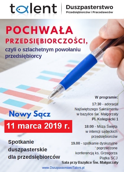 Duszpasterstwo Talent zaprasza wszystkie osoby związane z przedsiębiorczością. –Nie ma legitymacji, wpisowego, list obecności czy obowiązku . Tak działa Talent od 20 lat. Szczególnie zapraszamy młodych ludzi, aby posłuchali starszych od których mogą nabyć doświadczenia jak prowadzić i założyć swoje samodzielne miejsce pracy –zapraszają Organizatorzy Duszpasterstwa Talent – Godzenie biznesu z dekalogiem może okazać się […]