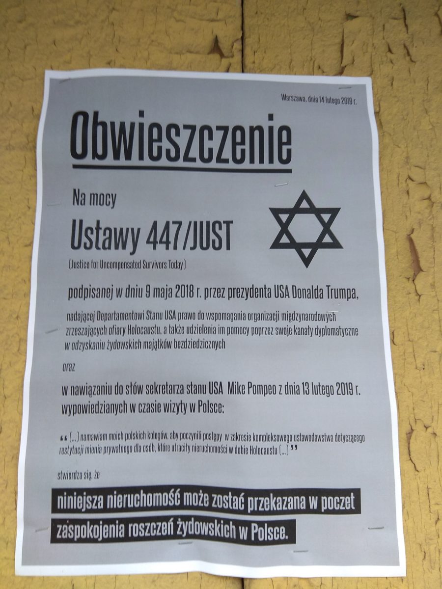 Anonimowo i pod osłoną nocy – w takim stylu w wielu miejscach w Starym Sączu zostały rozwieszone charakterystyczne plakaty z gwiazdą Dawida. Przekazywały nieprawdziwą treść: „niniejsza nieruchomość może zostać przekazana w poczet zaspokojenia roszczeń żydowskich w Polsce”. Mieszkańcy są zaskoczeni. Na kartce formatu A4 napisano: „Na mocy ustawy podpisanej przez prezydenta USA Donalda Trumpa, nadającej Departamentowi Stanu […]