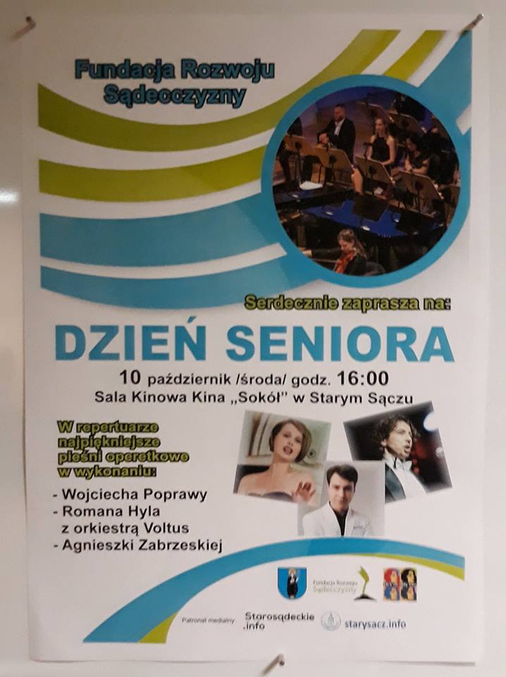 Fundacja Rozwoju Sądecczyzny zaprasza na Dzień Seniora do Kina Sokół, który odbędzie się w najbliższą środę (10 października) o godzinie 16:00. Będzie to niezwykły wieczór z niezwykłymi ludźmi -mówi Anna Majda, prezes fundacji -Prezentowani artyści raczyć nas będą pięknymi utworami. W programie: Brunetki, blondynki – R. Stolz Wojtek Czardasz Sylwii – Księżniczka Czardasza – I. […]