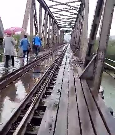 Awaria na torach. Ludzie w deszczu pieszo przez most kolejowy