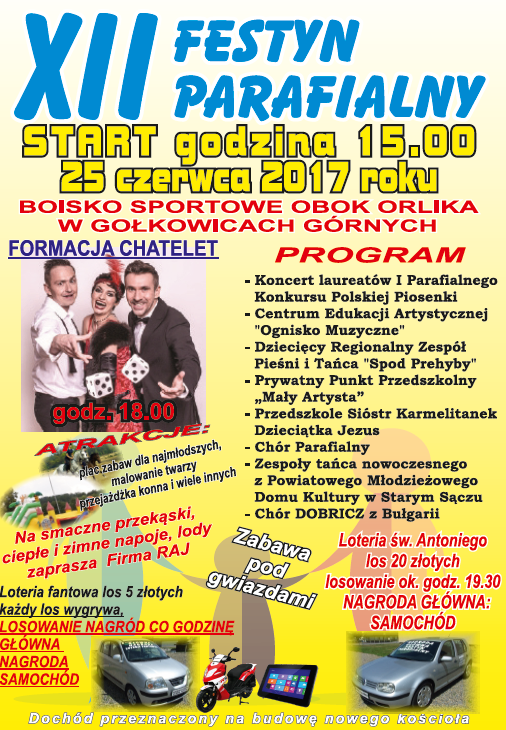 Już w najbliższą niedzielę (25 czerwca) o godzinie 15:00 na Boisku Sportowym w Gołkowicach Górnych odbędzie się XII Festyn Parafialny . Gwiazdą wieczoru będzie Formacja Chatelet. W programie między innymi występ Zespołu Regionalnego Spode Przehyby i Koncert Laureatów I Parafialnego Konkursu Piosenki. Nie zabraknie loterii św. Antoniego (cegiełka 20 zł) i loterii fantowej (5 zł) […]