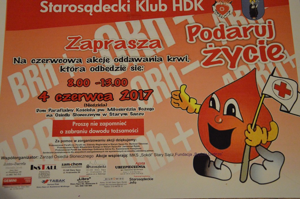 Już dzisiaj 4 czerwca (niedziela) Starosądecki Klub Honorowych Dawców Krwi PCK organizuje akcję oddawania krwi. W ten dzień każdy może podarować potrzebującym najcenniejszy prezent – kroplę życia. Aby oddać krew kandydat lub kandydatka musi spełniać ściśle określone warunki. Po pierwsze, ukończone 18 lat. Po drugie, dobry stan zdrowia i odpowiednia waga ciała. Całkowite przeciwwskazania mają osoby które chorowały […]