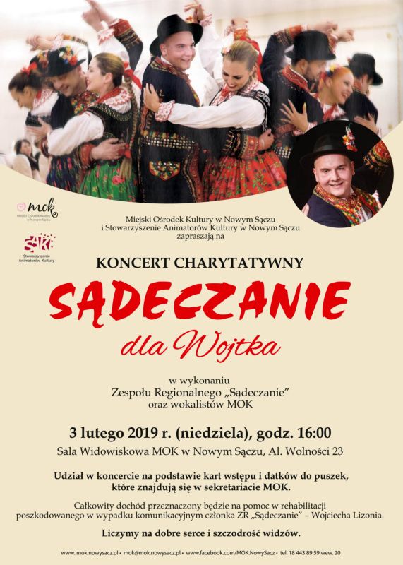 Miejski Ośrodek Kultury w Nowym Sączu zaprasza na koncert charytatywny w wykonaniu Zespołu Regionalnego „Sądeczanie” oraz wokalistów MOK-u, który odbędzie się w niedzielę, 3 lutego 2019 r. o godz. 16.00 w Sali Widowiskowej Miejskiego Ośrodka Kultury w Nowym Sączu. Dochód z koncertu przeznaczony zostanie na pomoc w rehabilitacji poszkodowanego w wypadku komunikacyjnym członka „Sądeczan” Wojciecha […]