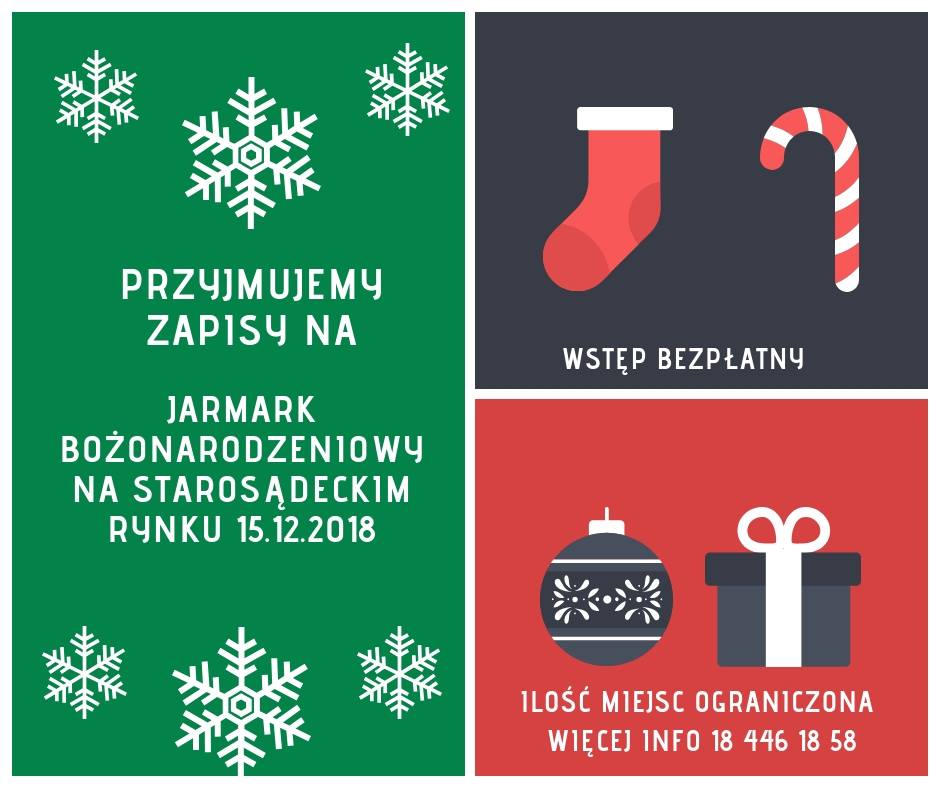 Już dzisiaj zapraszamy rękodzielników/ wystawców do zapisywania się na 2. Jarmark Bożonarodzeniowy, który odbędzie się na płycie Starosądeckiego Rynku. Udział w w wydarzeniu jest bezpłatny. Ilość miejsc ograniczona. Więcej informacji 18 446 18 58 .