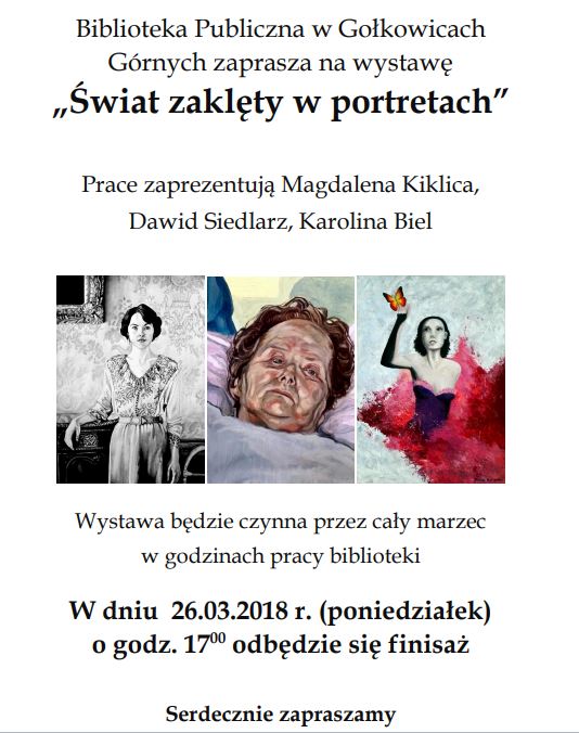 Biblioteka w Gołkowicach oraz artyści zapraszają wszystkich chętnych na finisaż wystawy pod tytułem: „Świat zaklęty w portretach”, który odbędzie się 26 marca 2018 r. o godzinie 17:00 w budynku Biblioteki Publicznej w Gołkowicach. Na wystawie można będzie obejrzeć rysunki i obrazy Karoliny Biel, Magdaleny Kiklicy i Dawida Siedlarza. Wystawa jest otwarta dla zwiedzających do końca […]