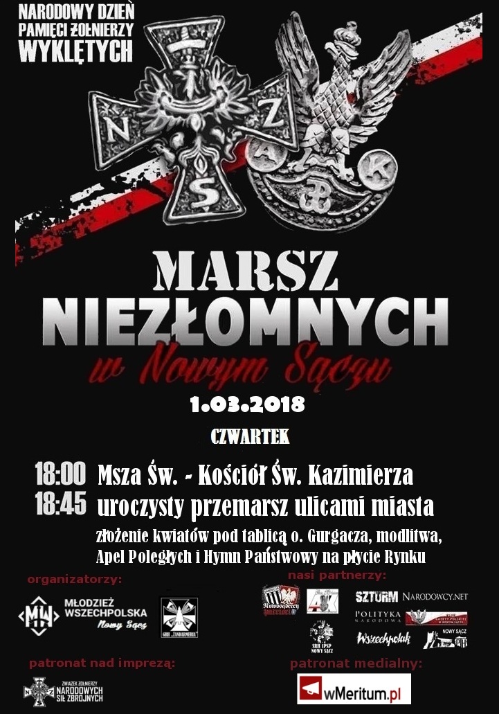 1 marca zbliża się wielkimi krokami. Tak jak w poprzednich latach, tak teraz już po raz piąty, sądeckie środowisko narodowe zorganizuje kolejny już Marsz Niezłomnych. Uroczystości rozpoczną się Mszą Św. sprawowaną w kościele Św. Kazimierza w Nowym Sączu o godz. 18:00 w dniu 1 marca. Po nabożeństwie przejdziemy ul. Kościuszki, deptakiem Jagiellońska, Lwowską pod tablicę […]