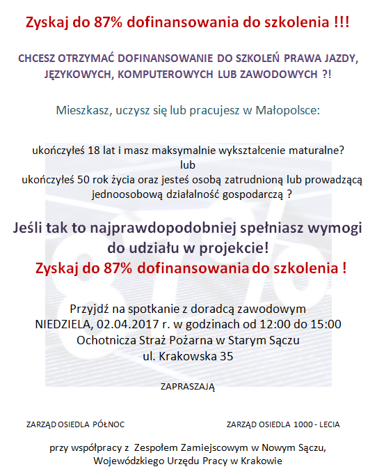 2 kwietnia 2017 roku w godzinach od 12:00 do 15:00 w budynku Ochotniczej Straży Pożarnej w Starym Sączu (ulica Krakowska 35) odbędzie się spotkanie z doradcą zawodowym na które zaprasza Antoni Sznajder, przewodniczący Osiedla Północ oraz Anetta Majda, przewodnicząca Osiedla 1000-lecia. Szczegóły na plakacie