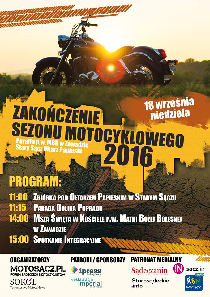 W imieniu całej EKIPY MOTOSACZ-a i Towarzystwa Motocyklowego Sokół, serdecznie zapraszamy wszystkich fanów dwóch kółek (tych mechanicznych:) do uczestnictwa w zakończeniu sezonu. Program (niedziela 18 września) 11:00 -Zbiórka pod Ołtarzem Papieskim w Starym Sączu 11:15 – Parada Doliną Popradu 14:00 – Msza Święta w Kościele p.w. Matki Bożej Bolesnej w Zawadzie 15:00 – Spotkanie Integracyjne […]