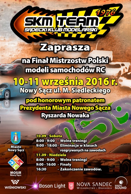 W weekend 10-11 września na torze modelarskim w Zawadzie (ul. Siedleckiego) odbędzie się Finał Mistrzostw Polski modeli samochodów RC. Patronat nad wydarzeniem objął Prezydent Nowego Sącza Ryszard Nowak. Przypomnijmy, że zaplanowane na najbliższy weekend Finały Mistrzostw Polski zostały poprzedzone eliminacjami, zorganizowanymi w pierwszej połowie lipca. Były to jednocześnie zawody inaugurujące działalność nowego toru modelarskiego na […]