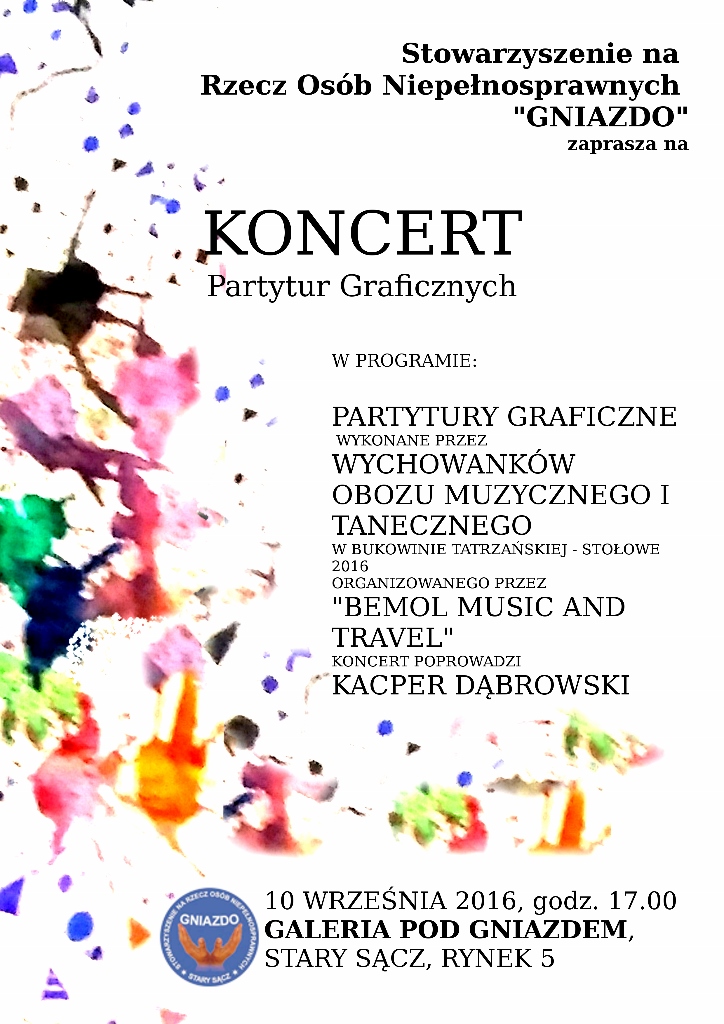 Już 10 września (sobota) w Galerii pod Gniazdem (Stary Sącz, Rynek 5) o godzinie 17:00 odbędzie się niezwykły koncert Partytur Graficznych. Młodzież z całej Polski (na własny koszt) przybędzie do Starego Sącza aby zaprezentować się właśnie w Grodzie św Kingi. Koncert poprowadzi starosądeczanin Kacper Dąbrowski. Wstęp wolny. Serdecznie zapraszamy!
