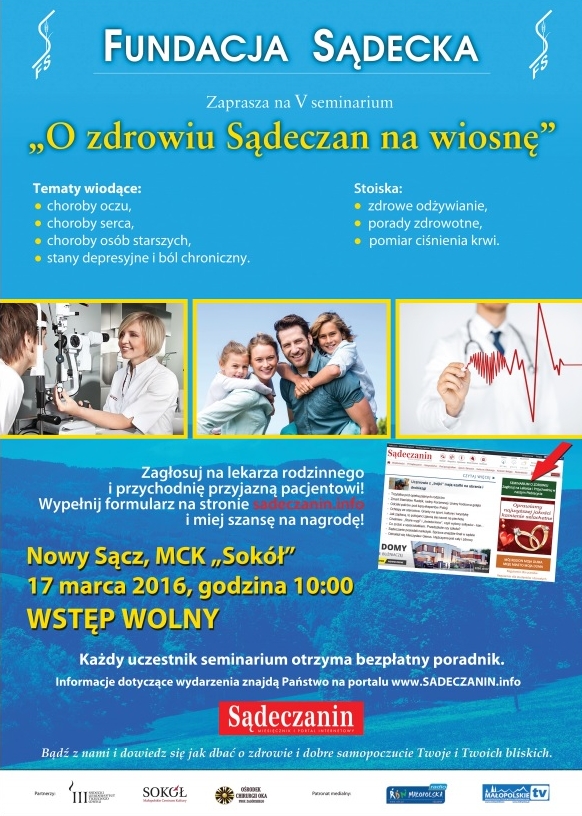 Dzisiaj (czwartek, 17 marca) w Małopolskim Centrum Kultury „Sokół” odbędzie się V Seminarium „O zdrowiu Sądeczan na wiosnę”. Seminarium rozpocznie się o godz. 10.00. Konferencję otworzy wiceprezes Zarządu Fundacji Sądeckiej Jerzy Bochyński. Podobnie jak w latach ubiegłych program seminarium obfitować będzie w ciekawe wykłady z różnych dziedzin medycyny. Tematami wiodącymi będą między innymi: choroby oczu, a […]