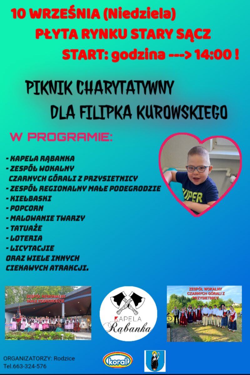 Już w ten weekend, 10 września na płycie rynku w Starym Sączu odbędzie się koncert charytatywny dla Filipa Kurowskiego. Filip Kurowski- to 4-letni chłopiec obciążony licznymi sprzężonymi wadami rozwojowymi, w wyniku których porusza się na wózku inwalidzkim. Rozszczep kręgosłupa, przepuklina oponowo- rdzeniowa, niedowład wiotki kończyn, wodogłowie, epilepsja, neurogenny pęcherz (cewnikowanie niezbędne co trzy godziny) – […]