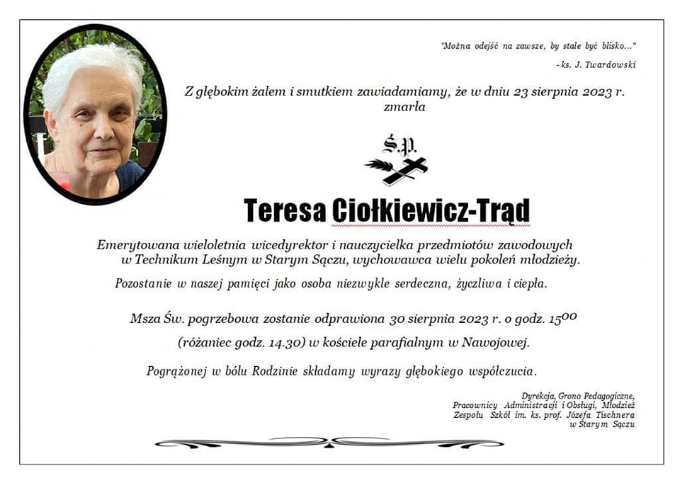 Z ogromnym smutkiem przyjęliśmy informację o śmierci pani Teresy Ciołkiewicz- Trąd, wieloletniej wicedyrektorce Zespołu Szkół w Starym Sączu, wspaniałej nauczycielce przedmiotów zawodowych w Technikum Leśnym. Pani Teresa nazywana była „Leśną Mamą” i w pamięci uczniów oraz nauczycieli zapisała się jako kobieta niezwykle serdeczna i życzliwa. Była wychowawcą wielu pokoleń młodzieży. Zmarła w wieku 69 lat. […]