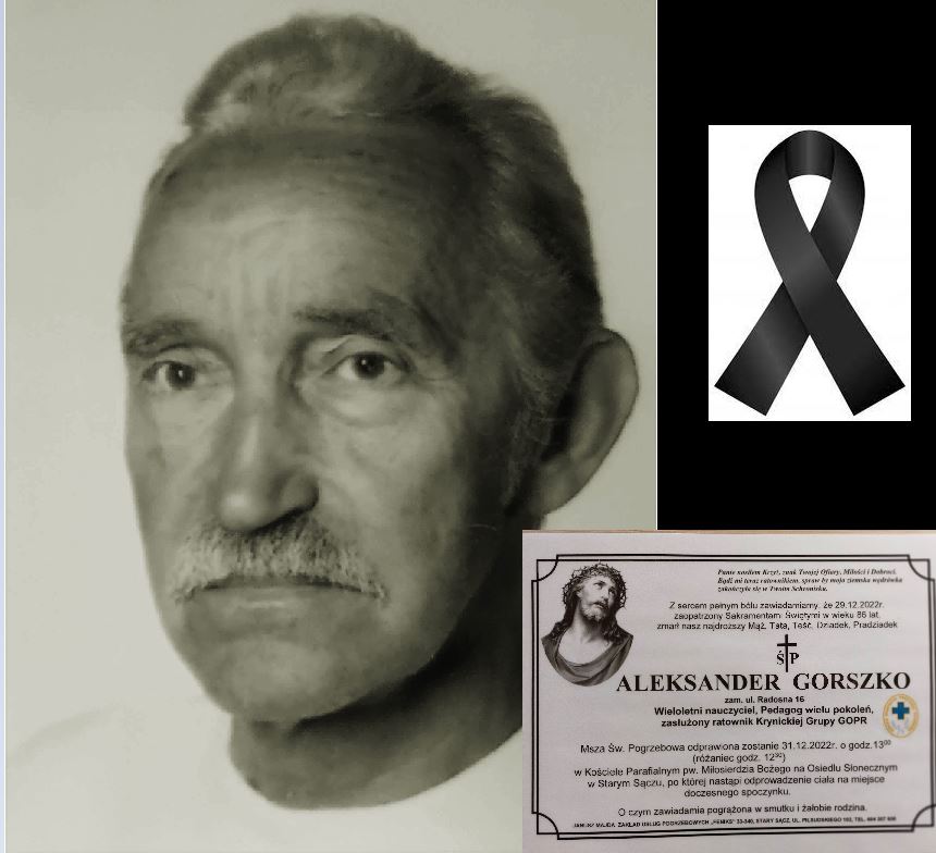 29 grudnia 2022 roku w wieku 86 lat zmarł wieloletni nauczyciel, pedagog i ratownik Krynickiej Grupy GOPR Aleksander Gorszko. Uroczystości pogrzebowe odbędą się w dniu jutrzejszym 31 grudnia o godzinie 13:00 w Kościele Parafialnym pw. Miłosierdzia Bożego na Osiedlu Słonecznym w Starym Sączu. Śp. Aleksander Gorszko urodził się 17.01.1936 roku. Ukończył słynnego „pedagoga” w Starym […]