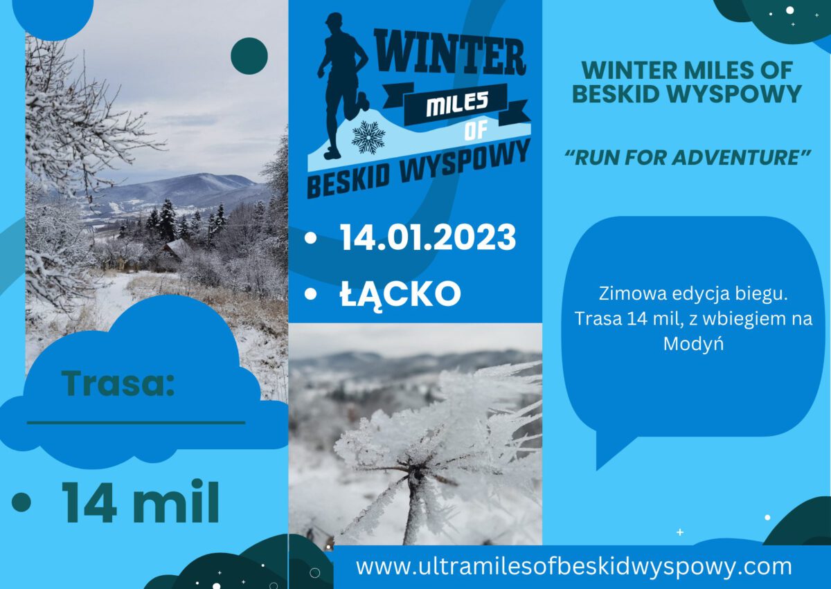 Już 14.01.2023 startuje pierwsza edycja Winter miles of Beskid Wyspowy. Bieg odbędzie się na trasie 14 mil (trasa pozostaje bez zmian w stosunku do trasy wiosennej). Trasa prowadzi z Amfiteatru w Łącku na górę Jeżową, skąd dalej biegacze pobiegną na Byniową, dalej w dół do Zbludzy i przepięknym mocnym podejściem czekać będzie ok 4 kilometrowa […]