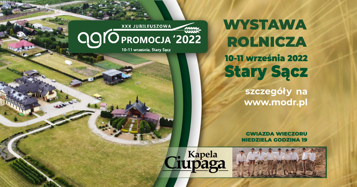 AGROPROMOCJA jest największą w Małopolsce cykliczną, plenerową wystawą rolniczą, którą odwiedza około 30-40 tys. osób. Po 2 latach przerwy, spowodowanej pandemią, powraca w jubileuszowym wydaniu i nowej lokalizacji! XXX Jubileuszowa Wystawa Rolnicza AGROPROMOCJA 2022 odbędzie się w dniach 10-11 września 2022 r. na terenie Diecezjalnego Centrum Pielgrzymowania im. Jana Pawła II w Starym Sączu. Organizatorem wydarzenia jest Małopolski Ośrodek Doradztwa Rolniczego […]