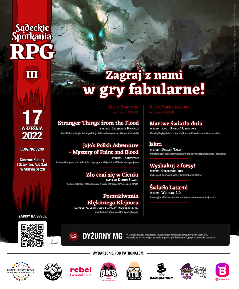 Po raz trzeci mamy przyjemność poinformować Państwa o kolejnej edycji Sądeckich Spotkań RPG. Wydarzenie odbędzie się 17 września 2022 r. w Centrum Kultury i Sztuki om. Ady Sary w Starym Sączu.Tak jak w przypadku poprzednich edycji, wydarzenie dotyczy promowania gier fabularnych. Czym są gry fabularne? Tzw. RPG (ang. Role-Playing Games).Wyobraźmy sobie, że czytamy naszą ulubioną książkę, […]