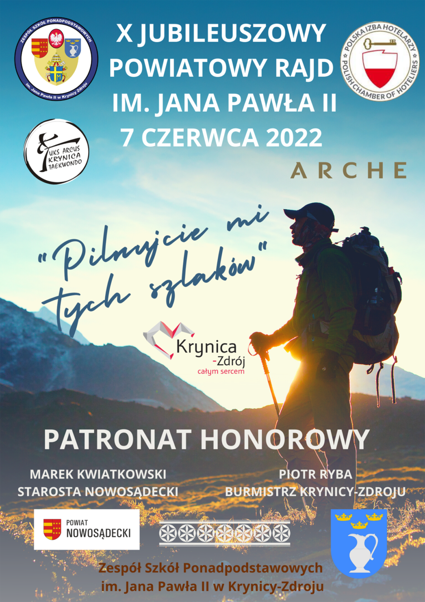 Po raz 10 na turystyczne szlaki wyruszą uczestnicy Powiatowego Rajdu im. Jana Pawła II, który odbywa się pod hasłem „Pilnujcie mi tych szlaków”.Rajd odbędzie się 7 czerwca, a patronat honorowy objął nad nim starosta nowosądecki Marek Kwiatkowski oraz burmistrz Krynicy-Zdroju Piotr Ryba. Organizatorem Rajdu jest Zespół Szkół Ponadpodstawowych im. Jana Pawła II w Krynicy-Zdroju.