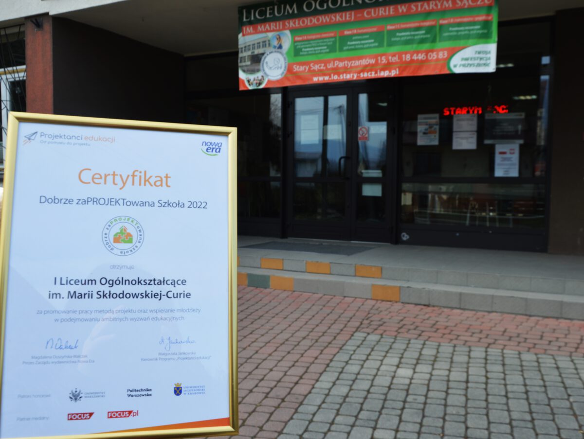 Liceum Ogólnokształcące im. Marii Skłodowskiej-Curie w Starym Sączu po raz trzeci z rzędu zostało uhonorowane certyfikatem „Dobrze zaPROJEKTowanej Szkoły” i znalazło się na mapie ogólnopolskich placówek dydaktyczno – wychowawczych, które podejmują ambitne wyzwania edukacyjne umożliwiające uczniom odkrywanie pasji i twórcze doskonalenie kompetencji XXI wieku. Honorowy patronat na konkursem sprawuje Minister Edukacji Narodowej, Uniwersytet Jagielloński, Uniwersytet Warszawski, Politechnika Warszawska […]