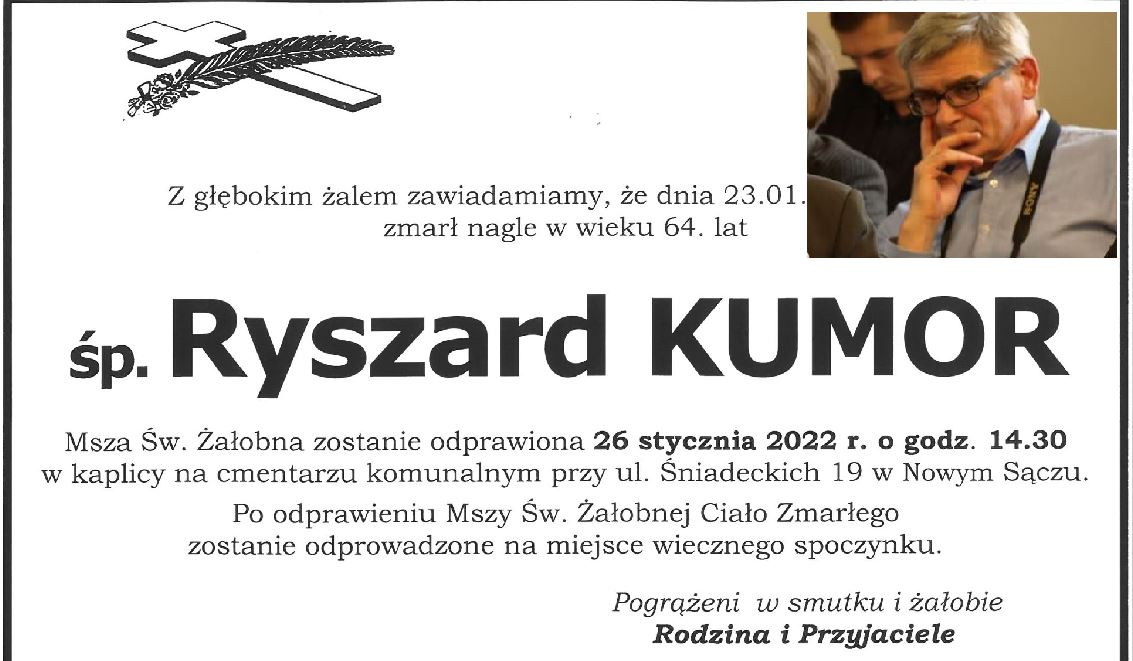 Zmarł nagle Ryszard Kumor, pracownik Urzędu Miejskiego w Starym Sączu i wieloletni redaktor Kuriera Starosądeckiego. To był jego ostatni tydzień w pracy przed przejściem na emeryturę. Śp. Ryszard był wieloletnim redaktorem Kuriera Starosądeckiego, związany z tym wydawnictwem niemal od początku jego istnienia, prekursorem lokalnej prasy i mediów internetowych. Elektroniczna wersja „wydania papierowego” kuriera, pojawiła się […]