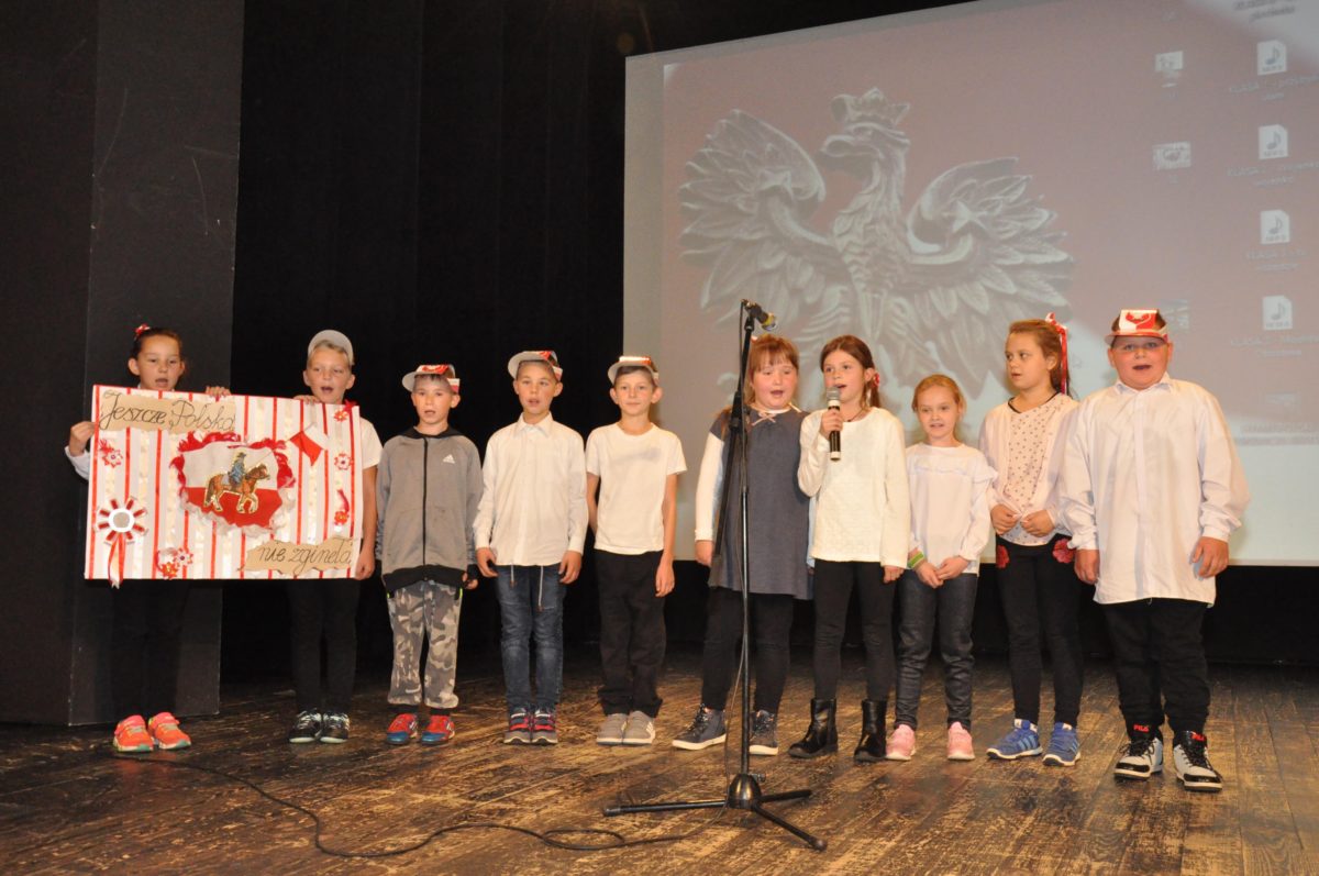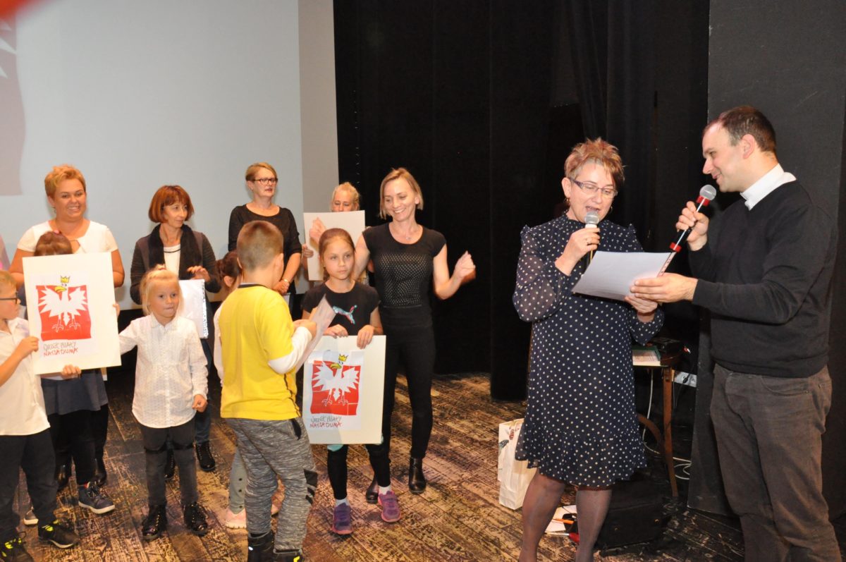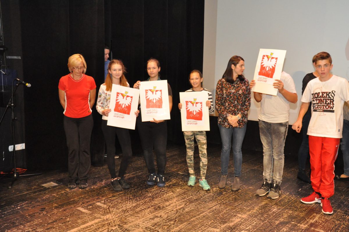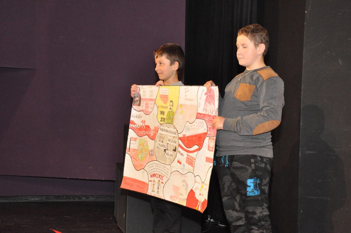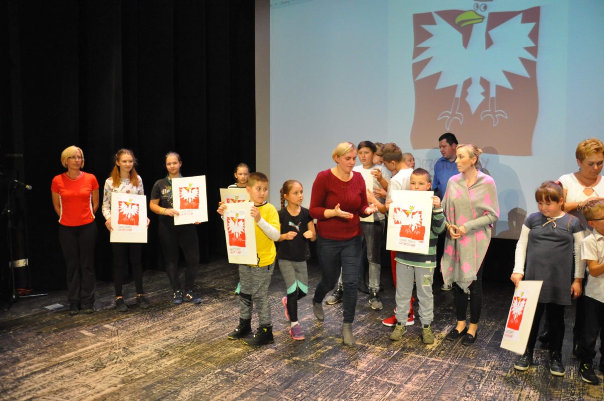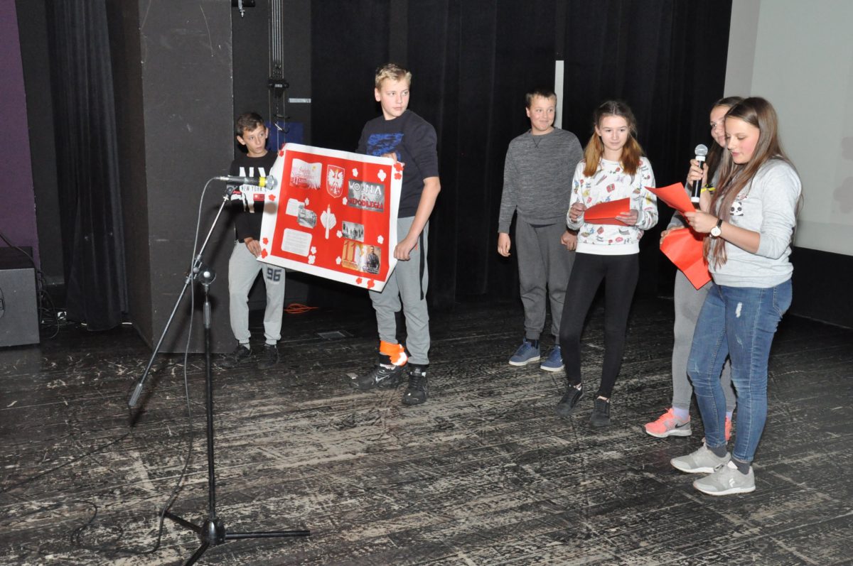Po zakończeniu gry i wykonaniu zadań uczniowie zebrali się w Centrum Sztuki i Kultury w Starym Sączu, gdzie Panie ze Stowarzyszenia Kobiet Popowickich wraz z Radą Rodziców przygotowali wspaniałą ucztę: były ciasta, ciasteczka, drożdżówki, serniki, kołacze, a nawet proziaki oraz ciepła herbata i soki. Tutaj dołączyła do nas zerówka, która również skorzystała z poczęstunku. Potem wszyscy przeszli do sali kinowej, gdzie po powitaniu przez ks. Tomasza, odbył się pokaz filmu poświęcony odzyskaniu przez Polskę Niepodległości. Następnie każda klasa prezentowała plakaty oraz piosenki lub prezentacje poświęcone naszej Ojczyźnie i walce o jej wolność. Gdy zakończyły się pokazy, oceniane przez Jury w składzie: Pani Dyrektor Grażyna Smaga, Pan Sołtys Czesław Kurzeja i Pani Stanisława Florkiewicz Prezes Stowarzyszenia Kobiet Ziemi Popowickiej, odbyły się konkursy, a mianowicie skakanie na skakance, robienie i rzut papierowym samolotem oraz układanie puzzli. Wszyscy uczestnicy wykazali się sprytem i odpowiednimi umiejętnościami. W tym czasie zebrani na sali energicznie kibicowali przedstawicielom swoich klas. Spotkanie zakończyło rozdanie dyplomów oraz nagród każda klasa otrzymała 100 zł, które przekaże na wspólne klasowe zajęcia integracyjne. Zanim wszyscy się rozeszli zaśpiewaliśmy hymn Polski – to była najbardziej wzruszająca chwila naszego spotkania. Pani dyrektor rozdała wszystkim uczestnikom małe, odblaskowe serduszka z napisem Polska na pamiątkę tego wspaniałego wydarzenia.