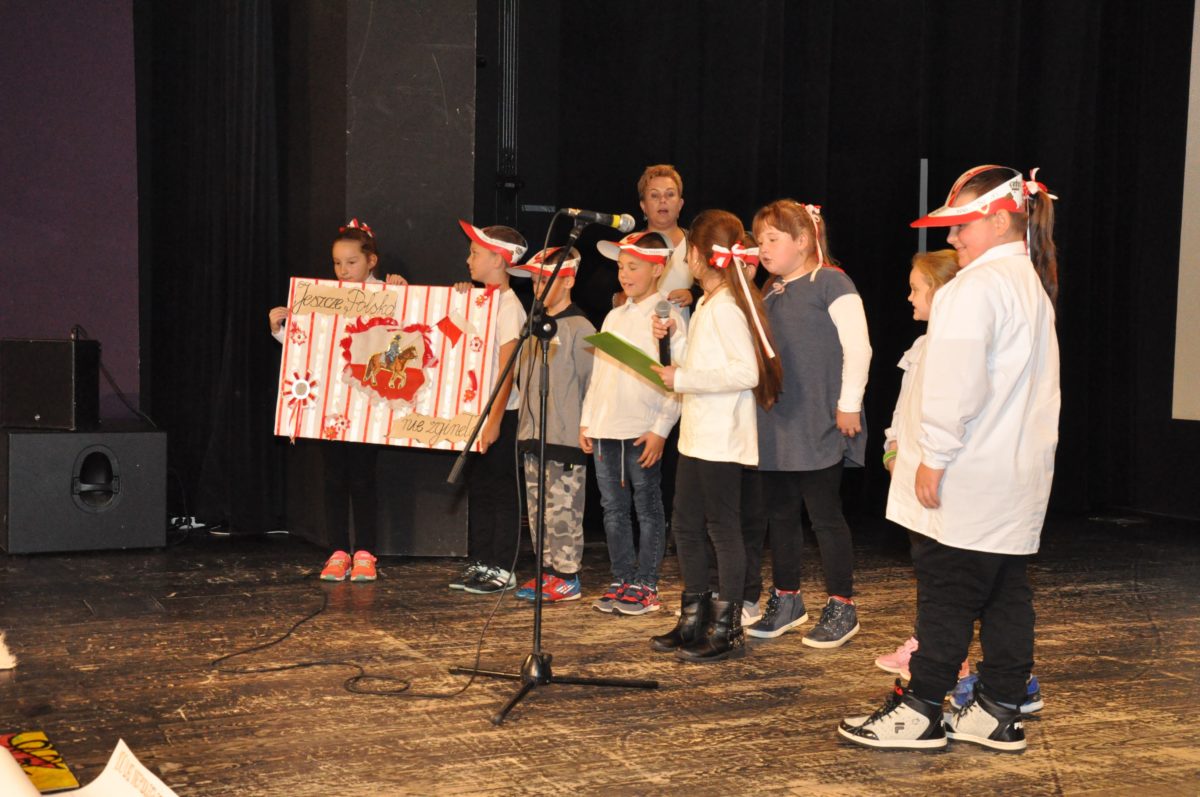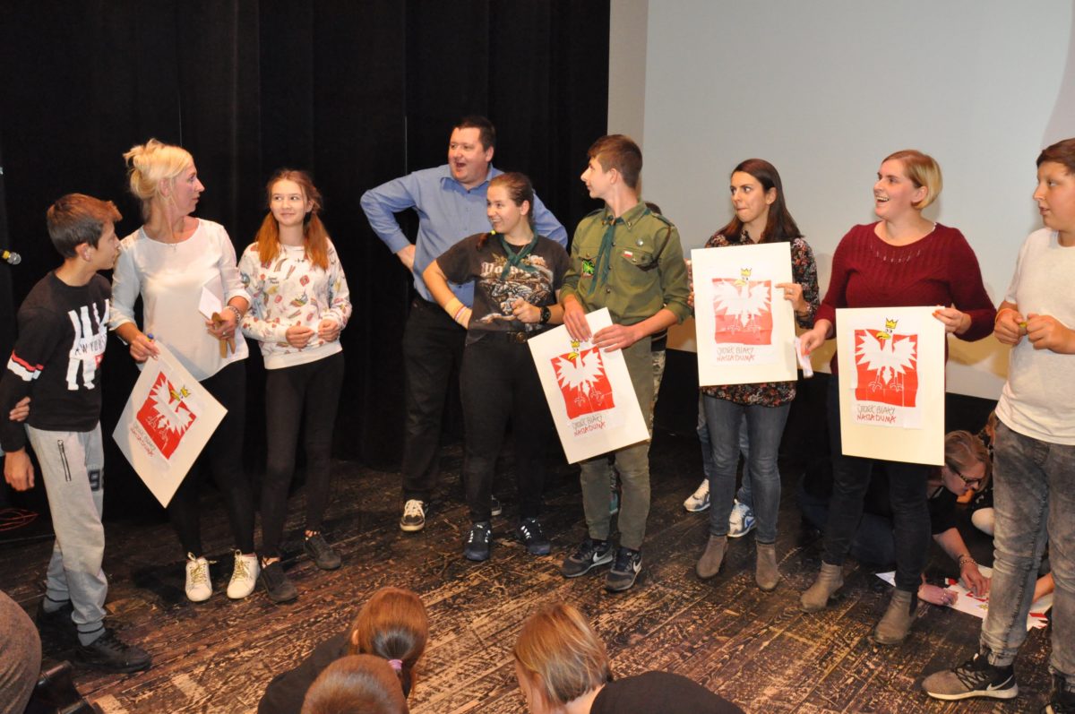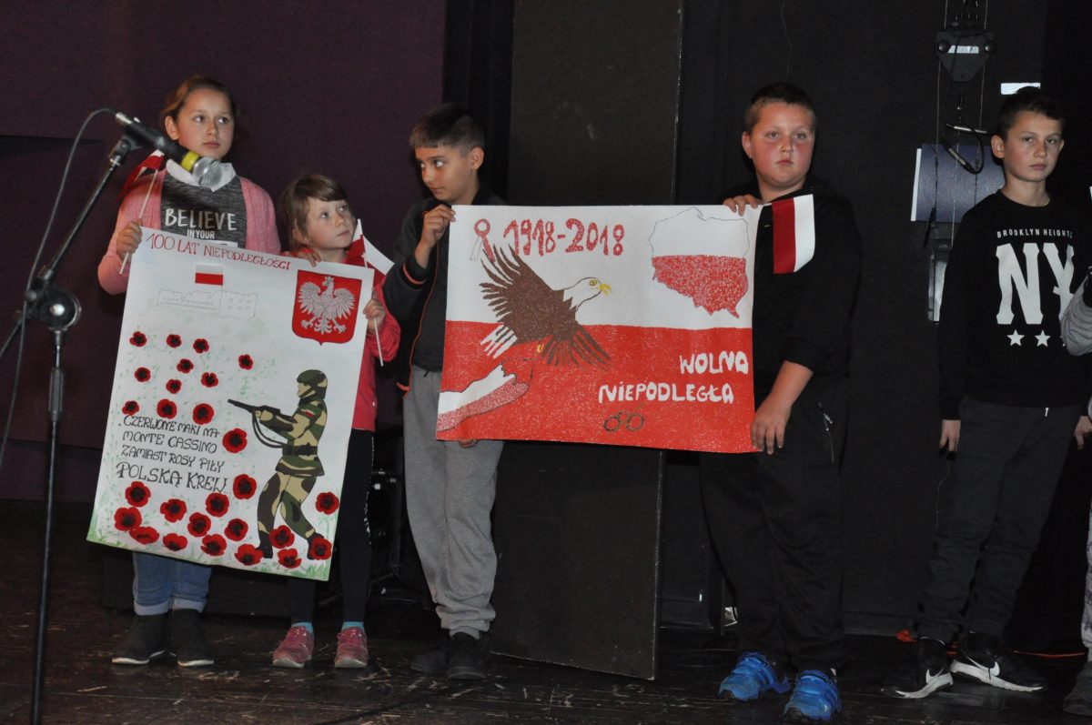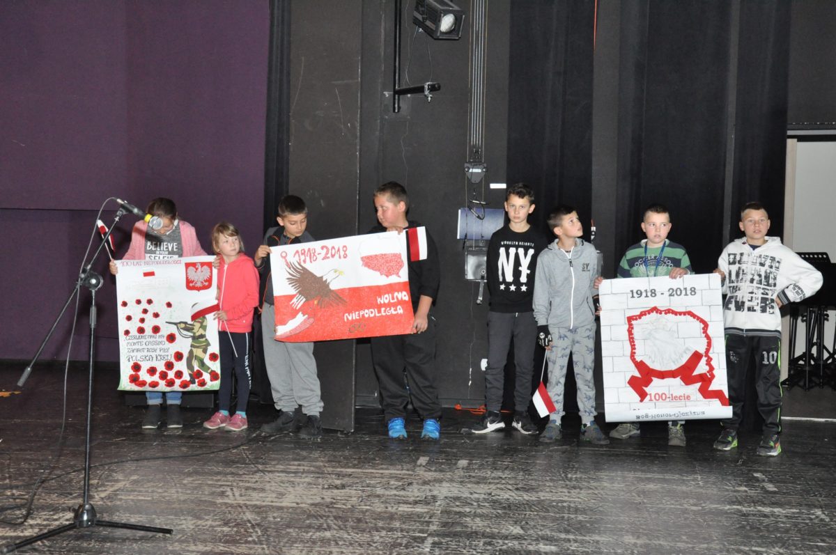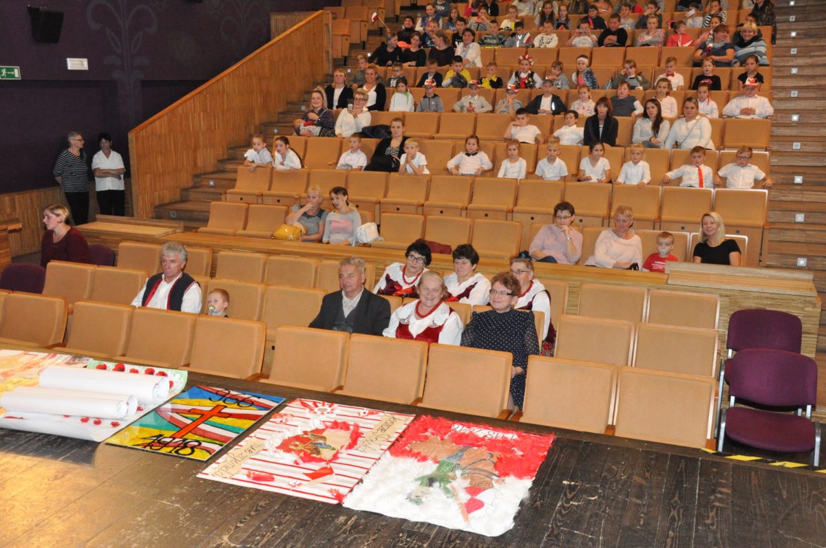 Po zakończeniu gry i wykonaniu zadań uczniowie zebrali się w Centrum Sztuki i Kultury w Starym Sączu, gdzie Panie ze Stowarzyszenia Kobiet Popowickich wraz z Radą Rodziców przygotowali wspaniałą ucztę: były ciasta, ciasteczka, drożdżówki, serniki, kołacze, a nawet proziaki oraz ciepła herbata i soki. Tutaj dołączyła do nas zerówka, która również skorzystała z poczęstunku. Potem wszyscy przeszli do sali kinowej, gdzie po powitaniu przez ks. Tomasza, odbył się pokaz filmu poświęcony odzyskaniu przez Polskę Niepodległości. Następnie każda klasa prezentowała plakaty oraz piosenki lub prezentacje poświęcone naszej Ojczyźnie i walce o jej wolność. Gdy zakończyły się pokazy, oceniane przez Jury w składzie: Pani Dyrektor Grażyna Smaga, Pan Sołtys Czesław Kurzeja i Pani Stanisława Florkiewicz Prezes Stowarzyszenia Kobiet Ziemi Popowickiej, odbyły się konkursy, a mianowicie skakanie na skakance, robienie i rzut papierowym samolotem oraz układanie puzzli. Wszyscy uczestnicy wykazali się sprytem i odpowiednimi umiejętnościami. W tym czasie zebrani na sali energicznie kibicowali przedstawicielom swoich klas. Spotkanie zakończyło rozdanie dyplomów oraz nagród każda klasa otrzymała 100 zł, które przekaże na wspólne klasowe zajęcia integracyjne. Zanim wszyscy się rozeszli zaśpiewaliśmy hymn Polski – to była najbardziej wzruszająca chwila naszego spotkania. Pani dyrektor rozdała wszystkim uczestnikom małe, odblaskowe serduszka z napisem Polska na pamiątkę tego wspaniałego wydarzenia.