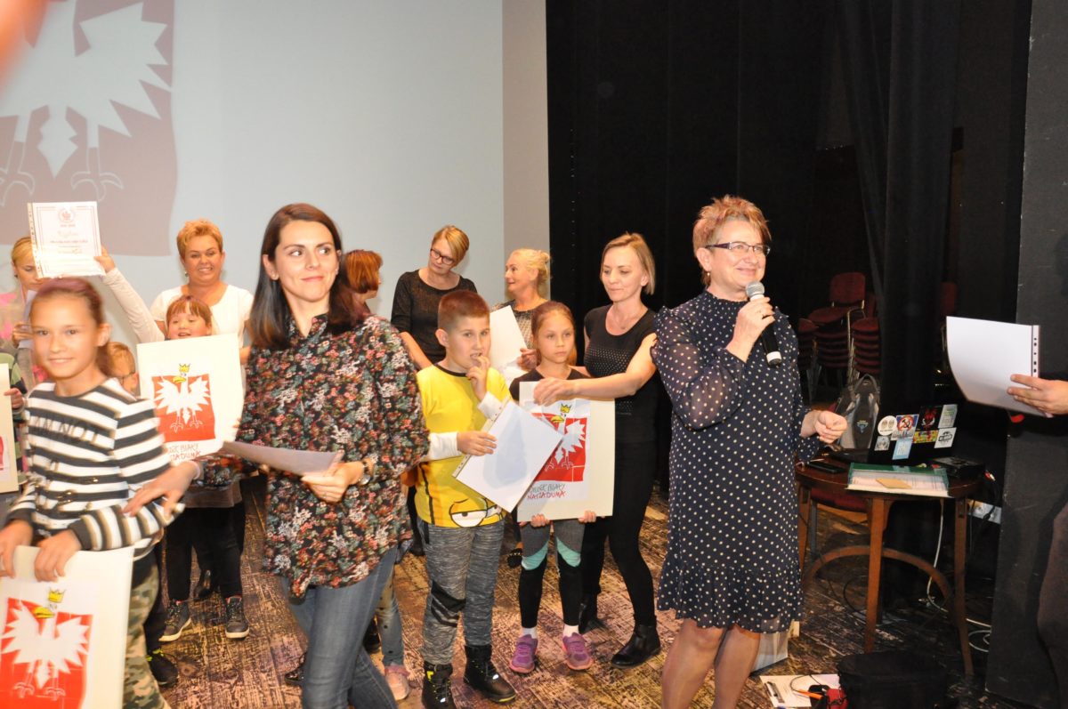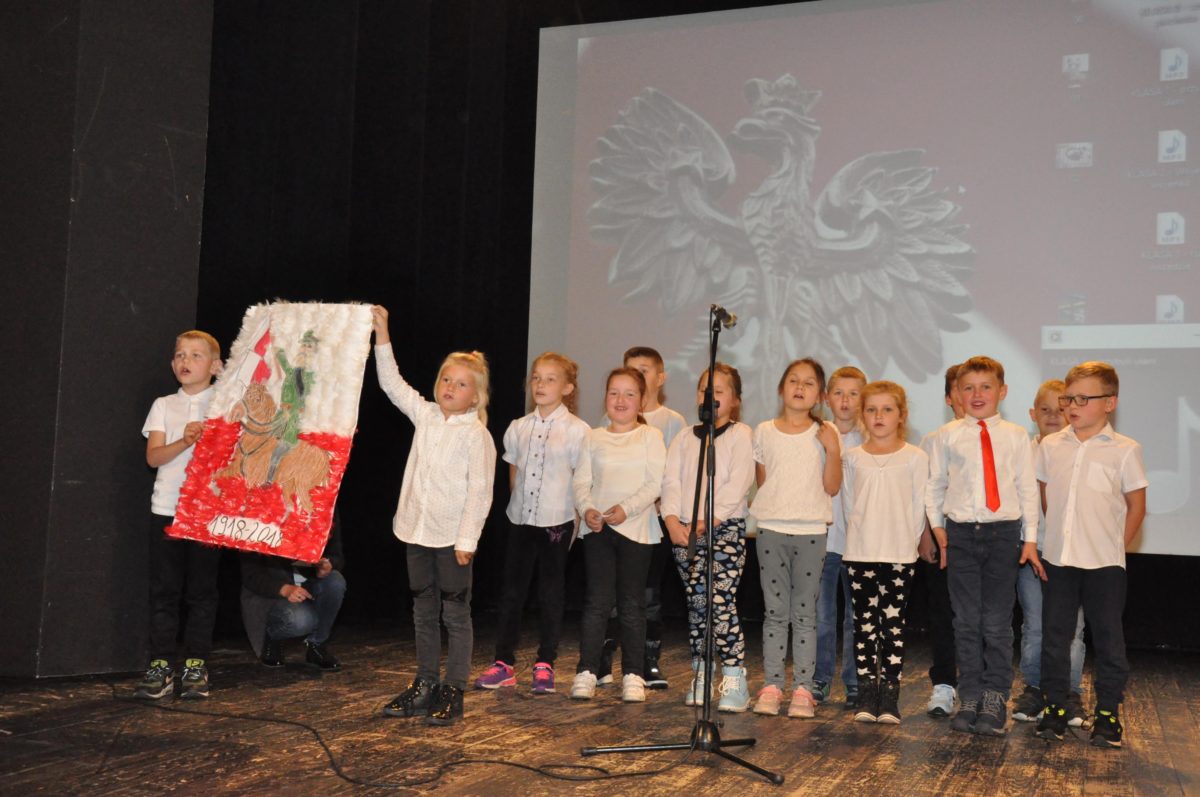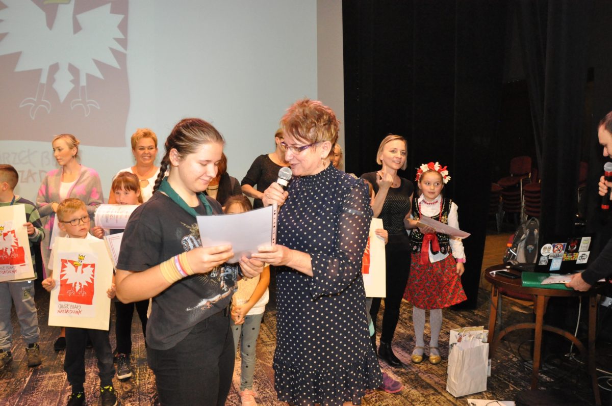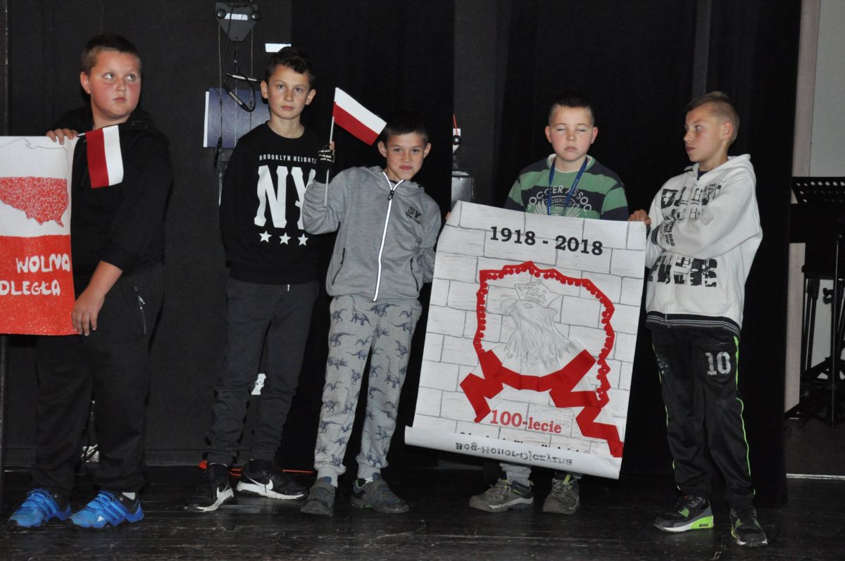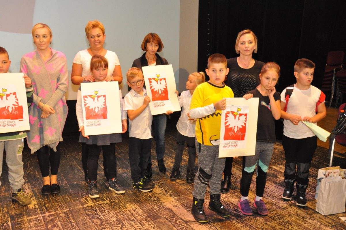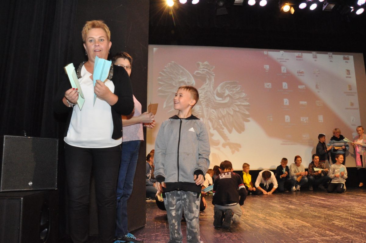 Po zakończeniu gry i wykonaniu zadań uczniowie zebrali się w Centrum Sztuki i Kultury w Starym Sączu, gdzie Panie ze Stowarzyszenia Kobiet Popowickich wraz z Radą Rodziców przygotowali wspaniałą ucztę: były ciasta, ciasteczka, drożdżówki, serniki, kołacze, a nawet proziaki oraz ciepła herbata i soki. Tutaj dołączyła do nas zerówka, która również skorzystała z poczęstunku. Potem wszyscy przeszli do sali kinowej, gdzie po powitaniu przez ks. Tomasza, odbył się pokaz filmu poświęcony odzyskaniu przez Polskę Niepodległości. Następnie każda klasa prezentowała plakaty oraz piosenki lub prezentacje poświęcone naszej Ojczyźnie i walce o jej wolność. Gdy zakończyły się pokazy, oceniane przez Jury w składzie: Pani Dyrektor Grażyna Smaga, Pan Sołtys Czesław Kurzeja i Pani Stanisława Florkiewicz Prezes Stowarzyszenia Kobiet Ziemi Popowickiej, odbyły się konkursy, a mianowicie skakanie na skakance, robienie i rzut papierowym samolotem oraz układanie puzzli. Wszyscy uczestnicy wykazali się sprytem i odpowiednimi umiejętnościami. W tym czasie zebrani na sali energicznie kibicowali przedstawicielom swoich klas. Spotkanie zakończyło rozdanie dyplomów oraz nagród każda klasa otrzymała 100 zł, które przekaże na wspólne klasowe zajęcia integracyjne. Zanim wszyscy się rozeszli zaśpiewaliśmy hymn Polski – to była najbardziej wzruszająca chwila naszego spotkania. Pani dyrektor rozdała wszystkim uczestnikom małe, odblaskowe serduszka z napisem Polska na pamiątkę tego wspaniałego wydarzenia.