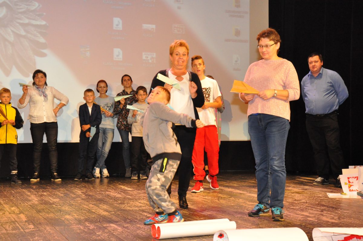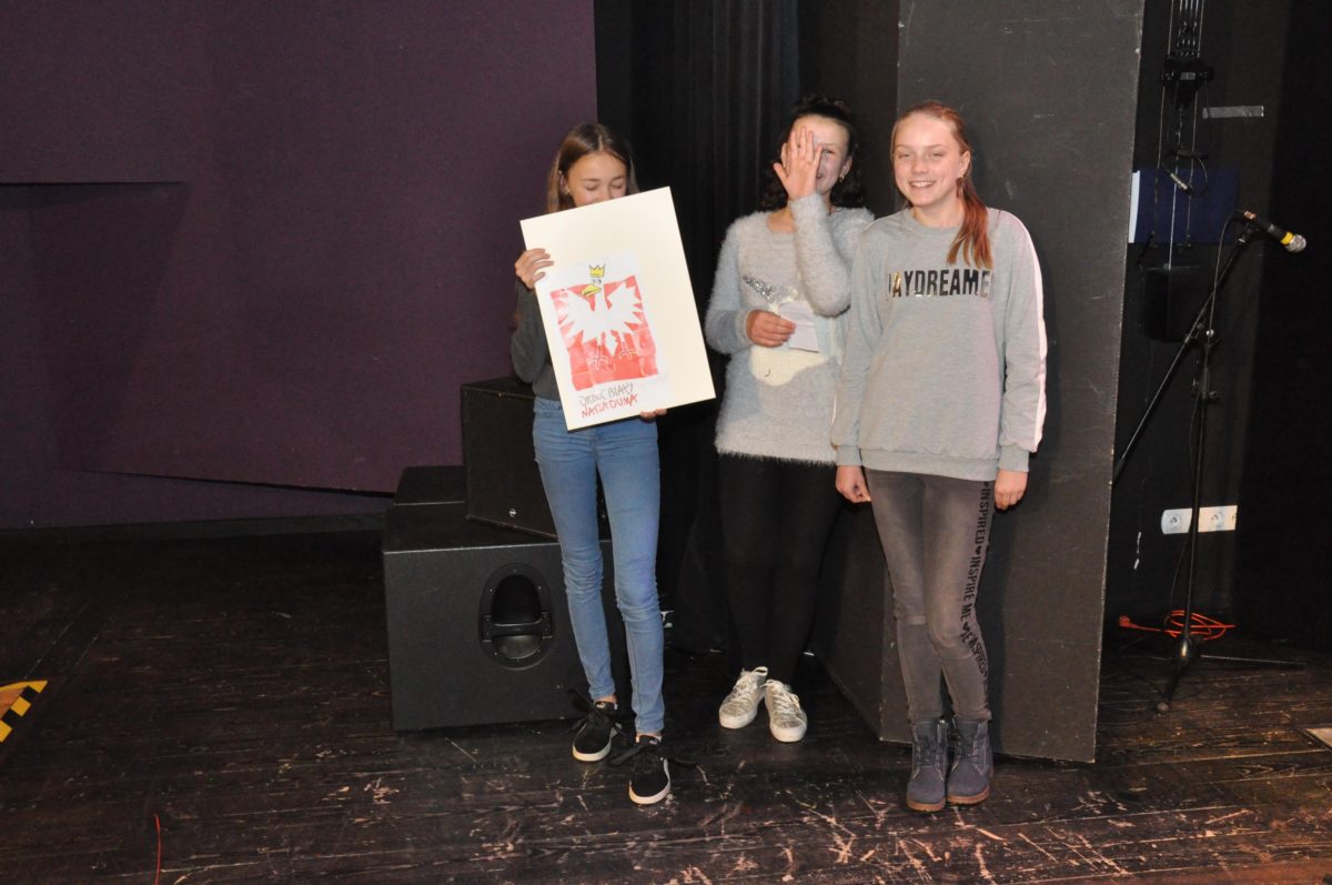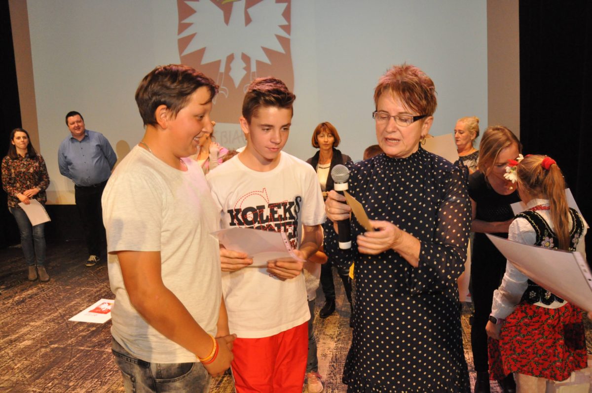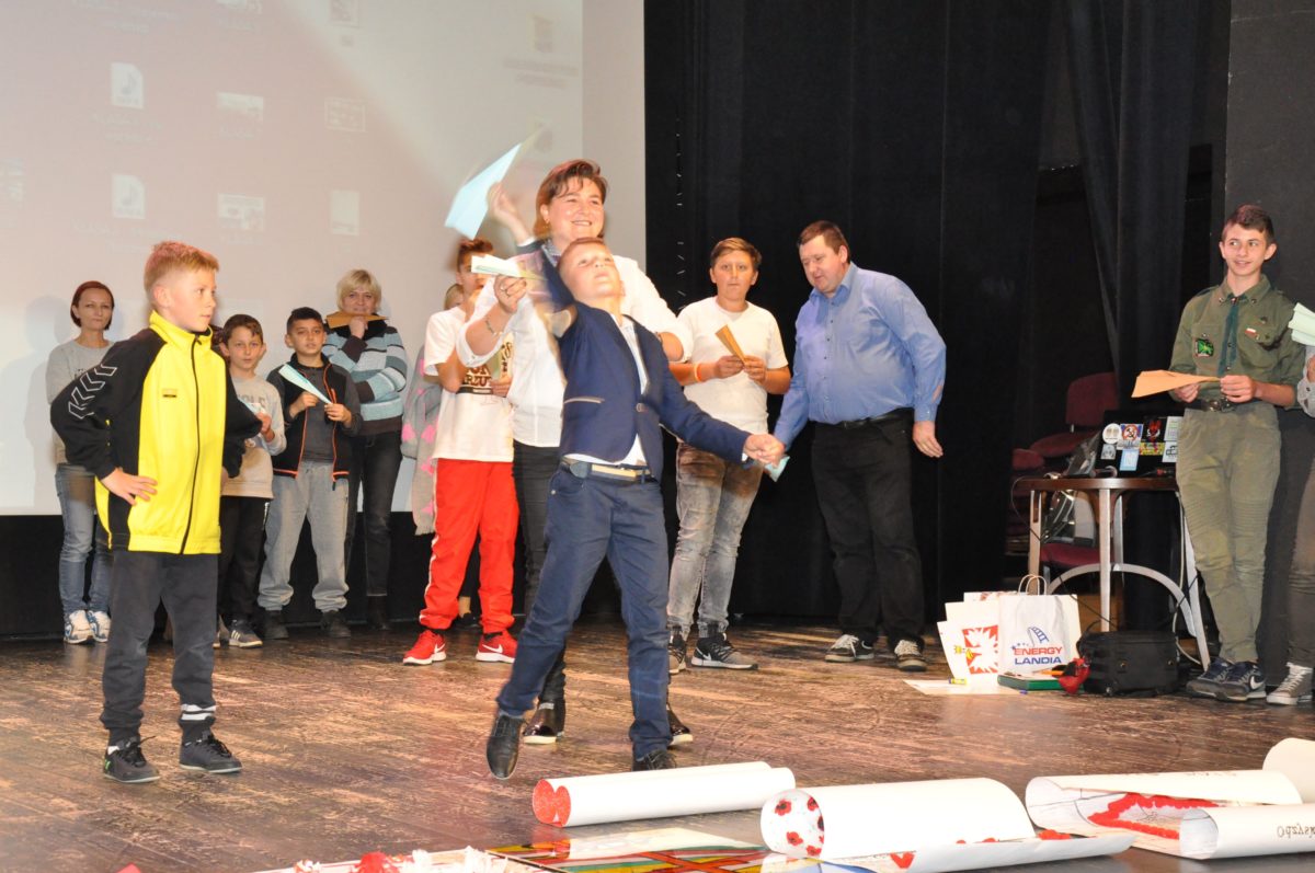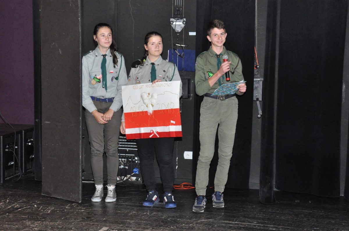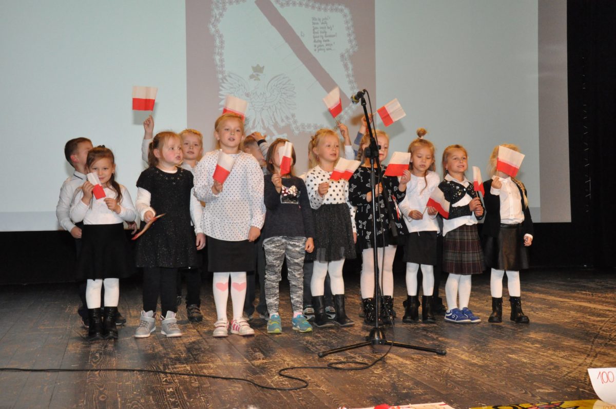 Po zakończeniu gry i wykonaniu zadań uczniowie zebrali się w Centrum Sztuki i Kultury w Starym Sączu, gdzie Panie ze Stowarzyszenia Kobiet Popowickich wraz z Radą Rodziców przygotowali wspaniałą ucztę: były ciasta, ciasteczka, drożdżówki, serniki, kołacze, a nawet proziaki oraz ciepła herbata i soki. Tutaj dołączyła do nas zerówka, która również skorzystała z poczęstunku. Potem wszyscy przeszli do sali kinowej, gdzie po powitaniu przez ks. Tomasza, odbył się pokaz filmu poświęcony odzyskaniu przez Polskę Niepodległości. Następnie każda klasa prezentowała plakaty oraz piosenki lub prezentacje poświęcone naszej Ojczyźnie i walce o jej wolność. Gdy zakończyły się pokazy, oceniane przez Jury w składzie: Pani Dyrektor Grażyna Smaga, Pan Sołtys Czesław Kurzeja i Pani Stanisława Florkiewicz Prezes Stowarzyszenia Kobiet Ziemi Popowickiej, odbyły się konkursy, a mianowicie skakanie na skakance, robienie i rzut papierowym samolotem oraz układanie puzzli. Wszyscy uczestnicy wykazali się sprytem i odpowiednimi umiejętnościami. W tym czasie zebrani na sali energicznie kibicowali przedstawicielom swoich klas. Spotkanie zakończyło rozdanie dyplomów oraz nagród każda klasa otrzymała 100 zł, które przekaże na wspólne klasowe zajęcia integracyjne. Zanim wszyscy się rozeszli zaśpiewaliśmy hymn Polski – to była najbardziej wzruszająca chwila naszego spotkania. Pani dyrektor rozdała wszystkim uczestnikom małe, odblaskowe serduszka z napisem Polska na pamiątkę tego wspaniałego wydarzenia.