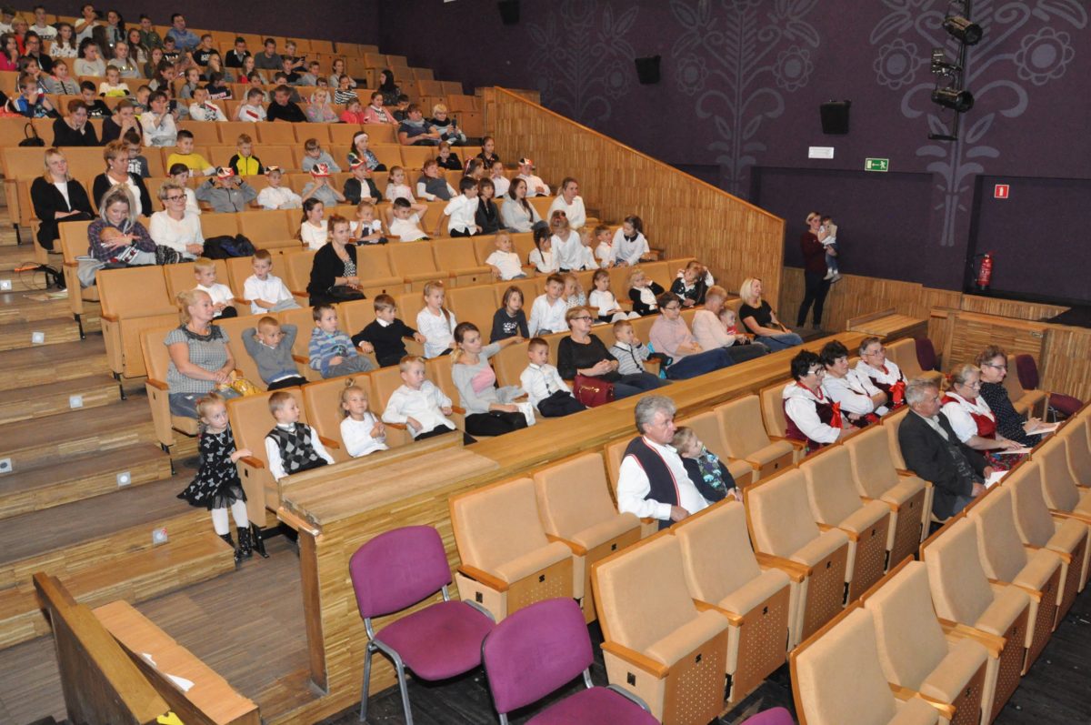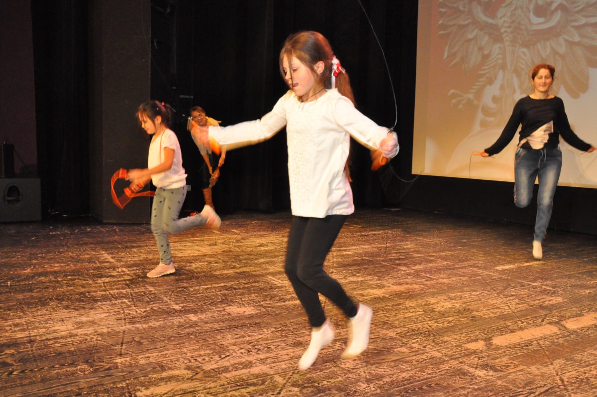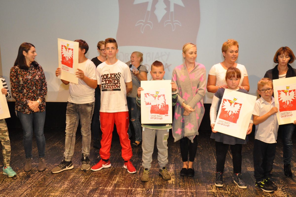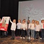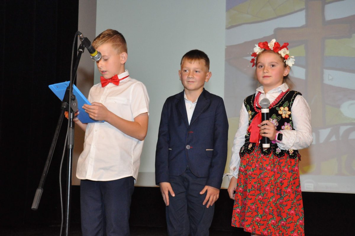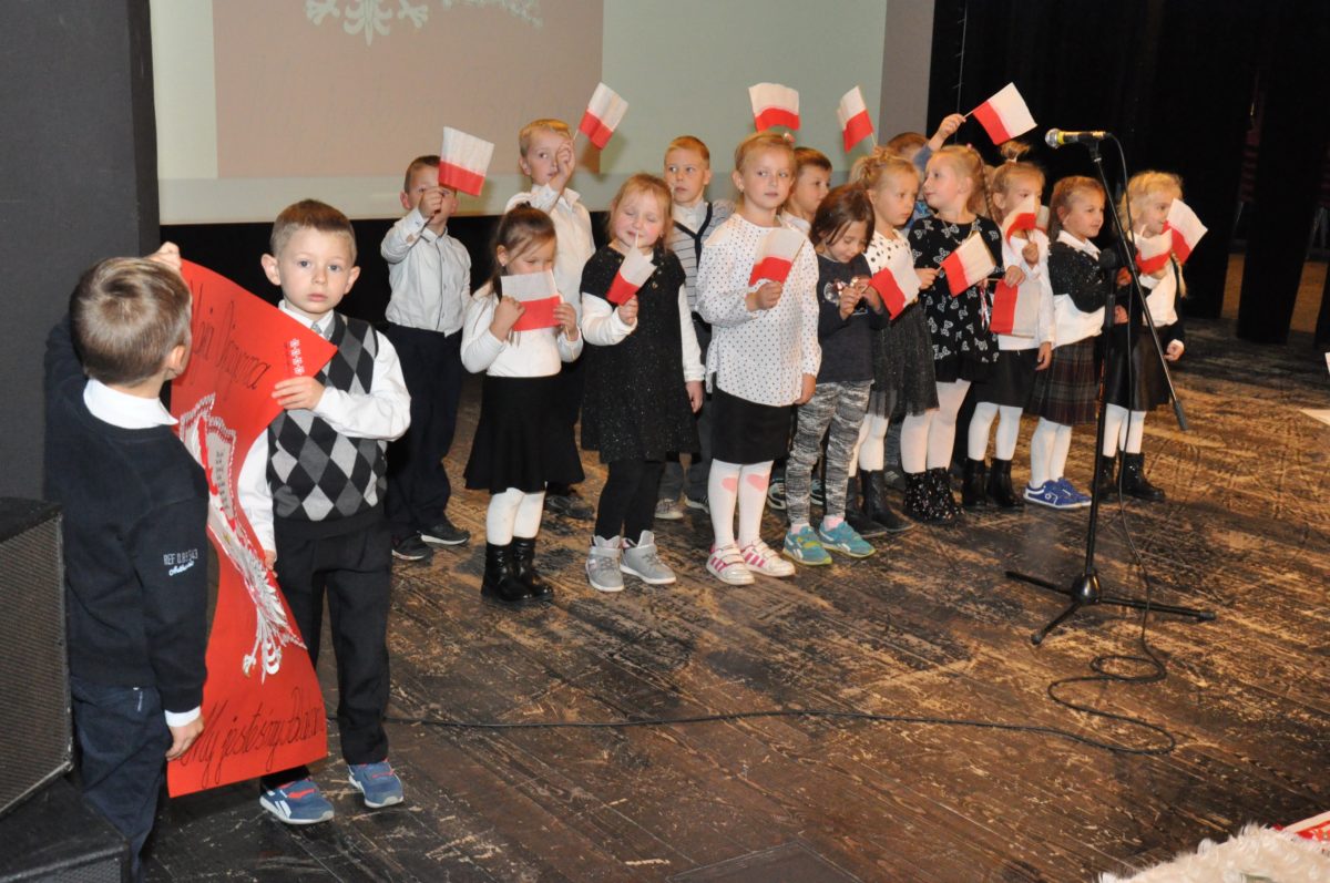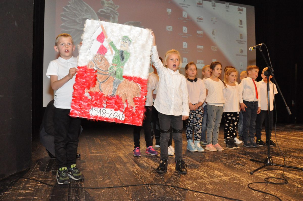 Po zakończeniu gry i wykonaniu zadań uczniowie zebrali się w Centrum Sztuki i Kultury w Starym Sączu, gdzie Panie ze Stowarzyszenia Kobiet Popowickich wraz z Radą Rodziców przygotowali wspaniałą ucztę: były ciasta, ciasteczka, drożdżówki, serniki, kołacze, a nawet proziaki oraz ciepła herbata i soki. Tutaj dołączyła do nas zerówka, która również skorzystała z poczęstunku. Potem wszyscy przeszli do sali kinowej, gdzie po powitaniu przez ks. Tomasza, odbył się pokaz filmu poświęcony odzyskaniu przez Polskę Niepodległości. Następnie każda klasa prezentowała plakaty oraz piosenki lub prezentacje poświęcone naszej Ojczyźnie i walce o jej wolność. Gdy zakończyły się pokazy, oceniane przez Jury w składzie: Pani Dyrektor Grażyna Smaga, Pan Sołtys Czesław Kurzeja i Pani Stanisława Florkiewicz Prezes Stowarzyszenia Kobiet Ziemi Popowickiej, odbyły się konkursy, a mianowicie skakanie na skakance, robienie i rzut papierowym samolotem oraz układanie puzzli. Wszyscy uczestnicy wykazali się sprytem i odpowiednimi umiejętnościami. W tym czasie zebrani na sali energicznie kibicowali przedstawicielom swoich klas. Spotkanie zakończyło rozdanie dyplomów oraz nagród każda klasa otrzymała 100 zł, które przekaże na wspólne klasowe zajęcia integracyjne. Zanim wszyscy się rozeszli zaśpiewaliśmy hymn Polski – to była najbardziej wzruszająca chwila naszego spotkania. Pani dyrektor rozdała wszystkim uczestnikom małe, odblaskowe serduszka z napisem Polska na pamiątkę tego wspaniałego wydarzenia.