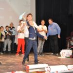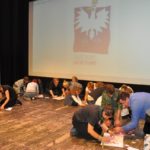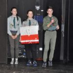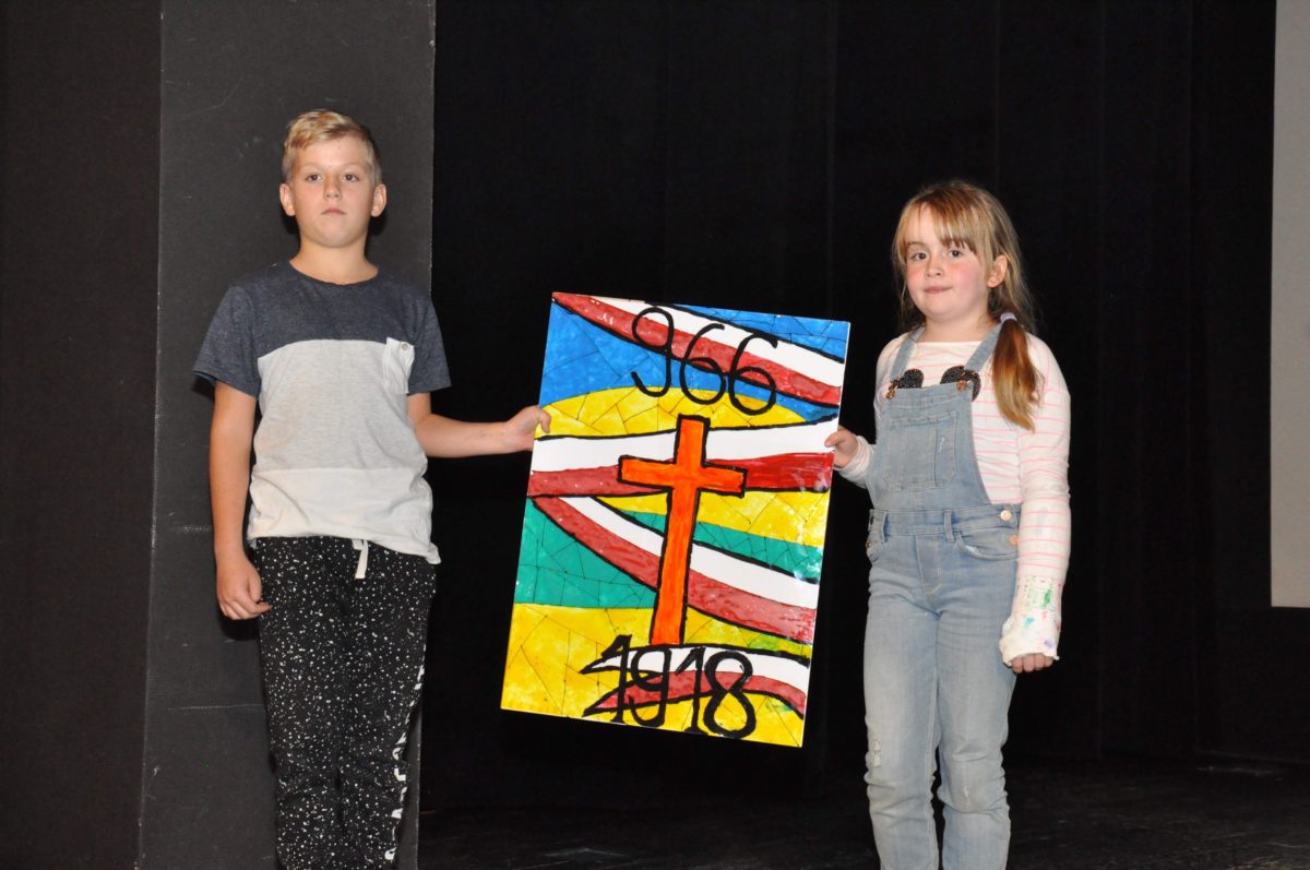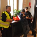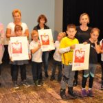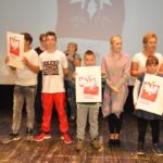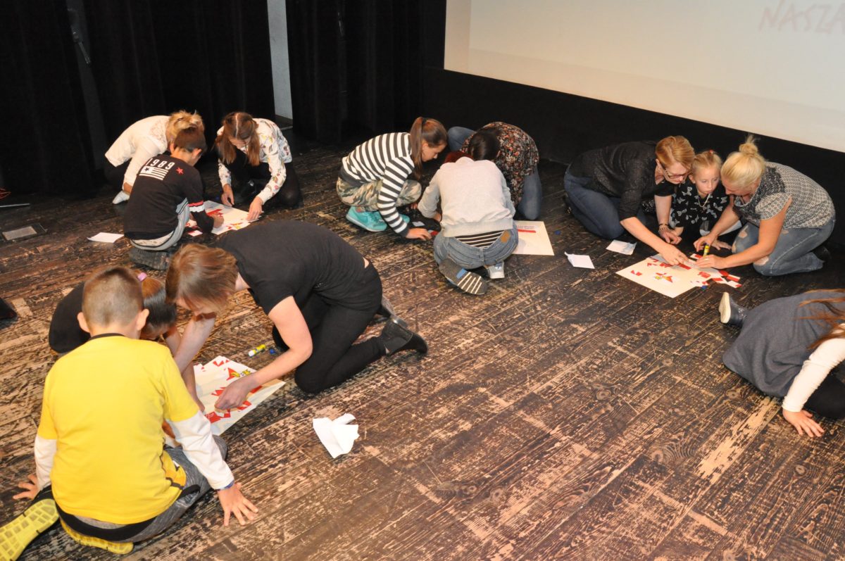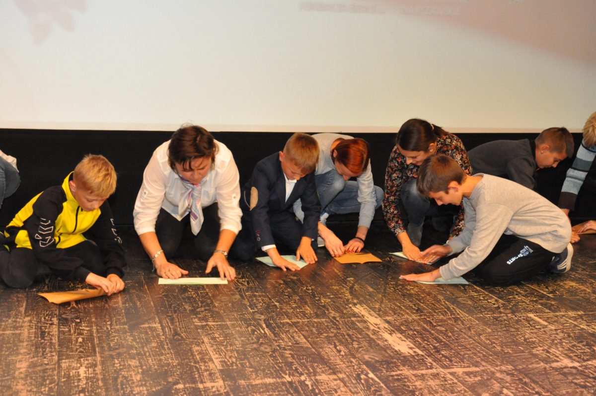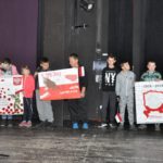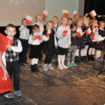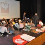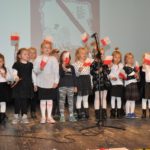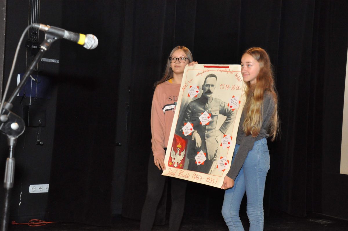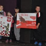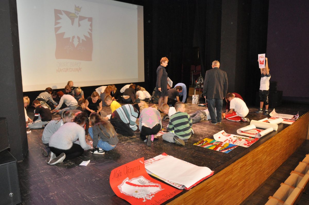Po zakończeniu gry i wykonaniu zadań uczniowie zebrali się w Centrum Sztuki i Kultury w Starym Sączu, gdzie Panie ze Stowarzyszenia Kobiet Popowickich wraz z Radą Rodziców przygotowali wspaniałą ucztę: były ciasta, ciasteczka, drożdżówki, serniki, kołacze, a nawet proziaki oraz ciepła herbata i soki. Tutaj dołączyła do nas zerówka, która również skorzystała z poczęstunku. Potem wszyscy przeszli do sali kinowej, gdzie po powitaniu przez ks. Tomasza, odbył się pokaz filmu poświęcony odzyskaniu przez Polskę Niepodległości. Następnie każda klasa prezentowała plakaty oraz piosenki lub prezentacje poświęcone naszej Ojczyźnie i walce o jej wolność. Gdy zakończyły się pokazy, oceniane przez Jury w składzie: Pani Dyrektor Grażyna Smaga, Pan Sołtys Czesław Kurzeja i Pani Stanisława Florkiewicz Prezes Stowarzyszenia Kobiet Ziemi Popowickiej, odbyły się konkursy, a mianowicie skakanie na skakance, robienie i rzut papierowym samolotem oraz układanie puzzli. Wszyscy uczestnicy wykazali się sprytem i odpowiednimi umiejętnościami. W tym czasie zebrani na sali energicznie kibicowali przedstawicielom swoich klas. Spotkanie zakończyło rozdanie dyplomów oraz nagród każda klasa otrzymała 100 zł, które przekaże na wspólne klasowe zajęcia integracyjne. Zanim wszyscy się rozeszli zaśpiewaliśmy hymn Polski – to była najbardziej wzruszająca chwila naszego spotkania. Pani dyrektor rozdała wszystkim uczestnikom małe, odblaskowe serduszka z napisem Polska na pamiątkę tego wspaniałego wydarzenia.