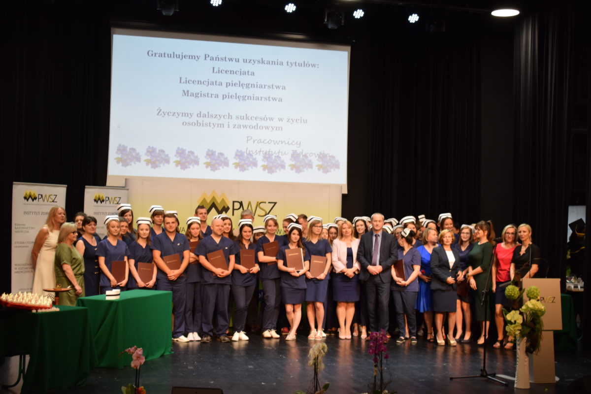 Po wystąpieniach nastąpiła długo oczekiwana chwila czepkowania absolwentów I stopnia kierunku Pielęgniarstwo oraz wręczenia dyplomów przez Dyrektora Instytutu Zdrowia dr hab. n. med. Ryszarda Gajdosza, prof. nadzw., Prorektor ds. studenckich i kształcenia dr Halinę Potok oraz Prorektora ds. nauki, rozwoju i współpracy doc. dr Marka Reichela. W pierwszej kolejności dyplom odbierali absolwenci, którzy uzyskali najlepsze wyniki w nauce oraz wyróżnili się działalnością na rzecz Uczelni i środowiska lokalnego. Tradycją Instytutu Zdrowia podczas takich uroczystości jest ceremoniał nałożenia czepka pielęgniarskiego i złożenia przyrzeczenia pielęgniarskiego. Czepek jest bardzo ważnym symbolem zawodu pielęgniarskiego, oznacza rzetelne przygotowanie do przyszłej pracy zawodowej oraz przestrzeganie etyki, świadczy o przynależności do grupy zawodowej pielęgniarek i pielęgniarzy.