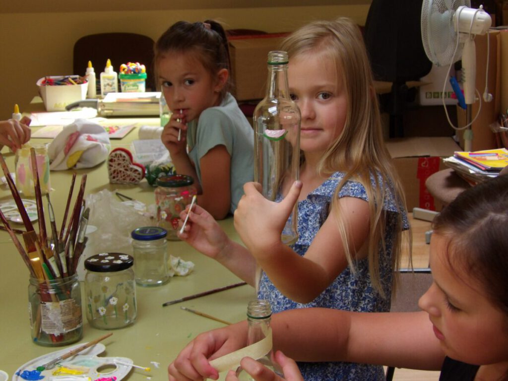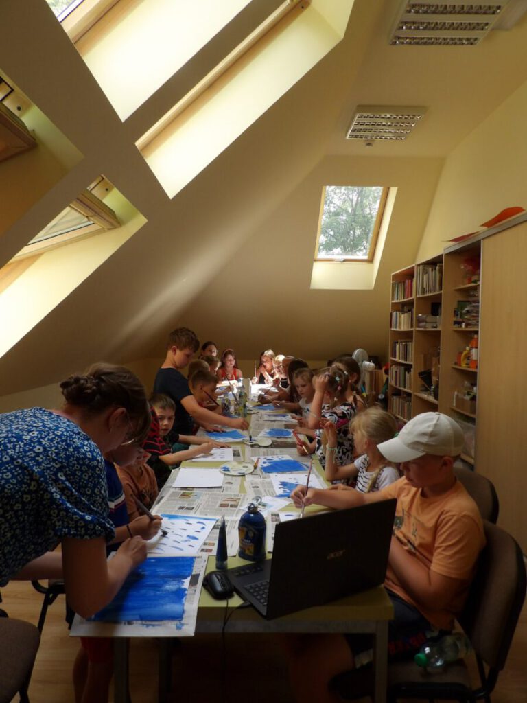 Prace plastyczne na wystawce w bibliotece jeszcze długo będą przypominać o tegorocznych zajęciach, a dzieci zabrały mnóstwo wspomnień i inspiracji na resztę wakacji.
