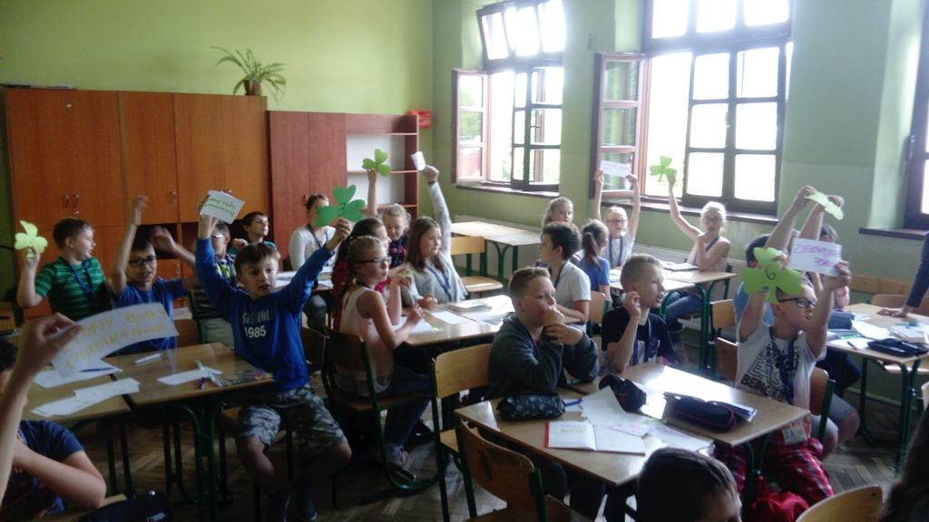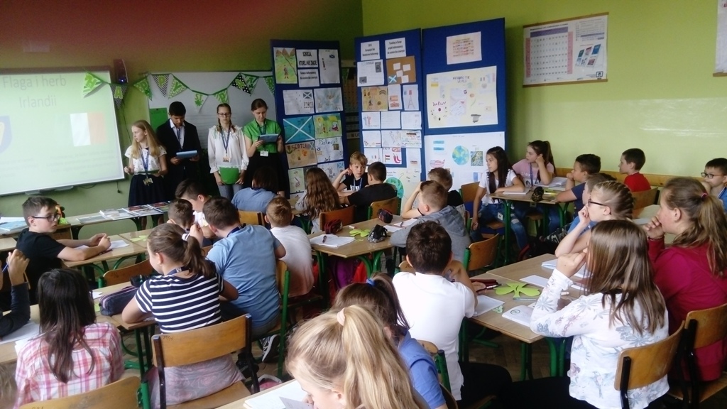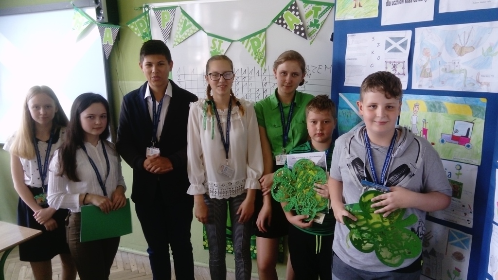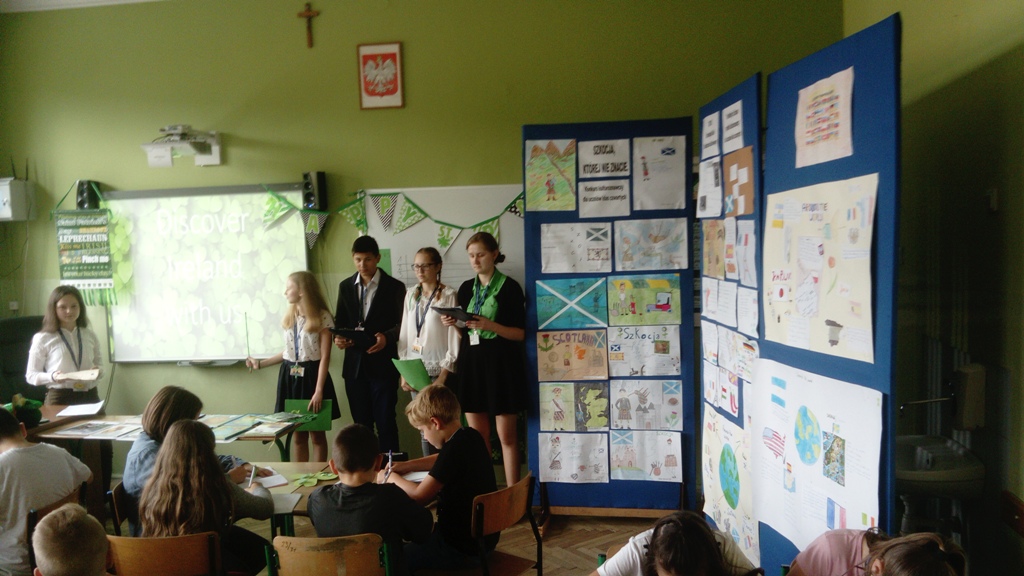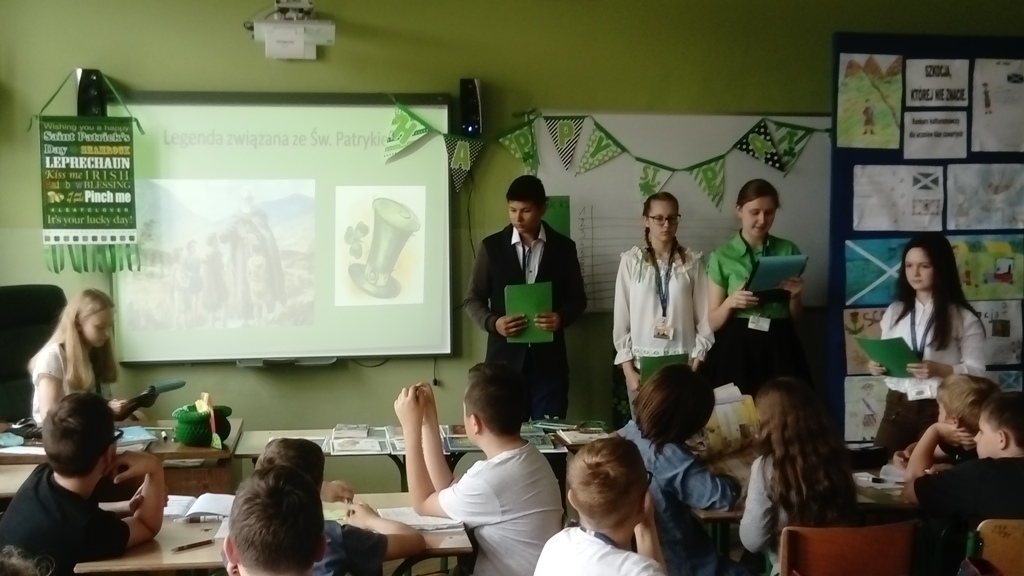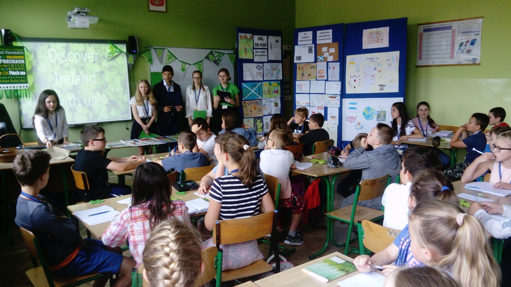 Na czwartoklasistów czekała jeszcze jedna kulturoznawcza niespodzianka przygotowana przez uczniów z klasy 2b gimnazjum, którzy zaprosili uczniów klasy IVa i IVb do udziału w warsztatach kulturoznawczych o Irlandii. Podczas interaktywnej podróży po Irlandii, uczniowie odwiedzili więc Dublin, czyli stolicę Irlandii położoną nad rzeką Liffey. Dowiedzieli się również, gdzie dokładnie leży Irlandia i jak wygląda prawdziwy podręcznik do języka irlandzkiego, z którego uczą się irlandzkie dzieci w szkołach. Zobaczyli irlandzkie godło, czyli złotą harfę ze srebrnymi strunami na niebieskim tle. Każdy czwartoklasista wie już również jakie kolory znajdują się na irlandzkiej fladze. Gimnazjaliści zabrali młodszych kolegów w interaktywną podróż po wybranych atrakcjach turystycznych Irlandii. Zobaczyli więc miejsce słynące z bajkowych krajobrazów i jezior, czyli Park Narodowy Killarney. Kolejne niezwykłe miejsce, które poznali, to Newgrange, czyli grobowiec z kamiennymi korytarzami sprzed ponad 4 tysięcy lat. Odwiedzili również klify Moher, czyli irlandzki cud natury, a także zoo w Dublinie. Zatrzymali się na chwilę w mieście Cork, będącym drugim co do wielkości miastem w Irlandii; jak i również zobaczyli Katedrę Św. Aidana w Enniscorthy i opactwo Kylemore, słynące również z przepięknych ogrodów- Victorian Walled Garden. Dowiedzieli się również kim był Święty Patryk, czyli patron Irlandii i jakie legendy są z nim związane; a także dlaczego koniczynka stała się symbolem Irlandii, a Dzień Świętego Patryka obchodzony jest 17 marca. Poznali także irlandzkie skrzaty, zwane leprechauns. Wiktoria Weber pokazała czwartoklasistom własne zdjęcia zrobione podczas obchodów Dnia Świętego Patryka w Irlandii. Na zakończenie warsztatów, uczniowie wzięli udział w emocjonującym quizie kulturoznawczym. Pracowali w zespołach, w których znaleźli się zupełnie losowo w zależności od numeru znajdującego się na koniczynce wylosowanej tuż przed wejściem do sali lekcyjnej. Na najlepszy zespół czekały oczywiście irlandzkie nagrody. Czwartoklasiści udowodnili, iż byli bardzo uważni podczas irlandzkiej wyprawy i zaskakiwali swoją wiedzą. 10 zespołów walczyło o zwycięstwo udzielając odpowiedzi na pytania. Ostatecznie zwycięzcami Konkursu Wiedzy o Irlandii zostali Aleksander Dudar z klasy IVb oraz Oskar Skoczeń z klasy IVa.