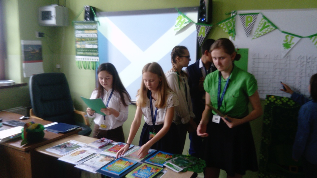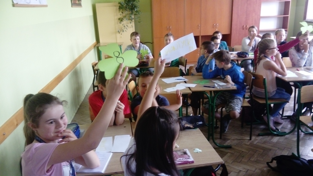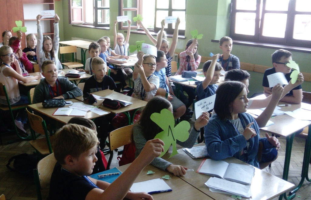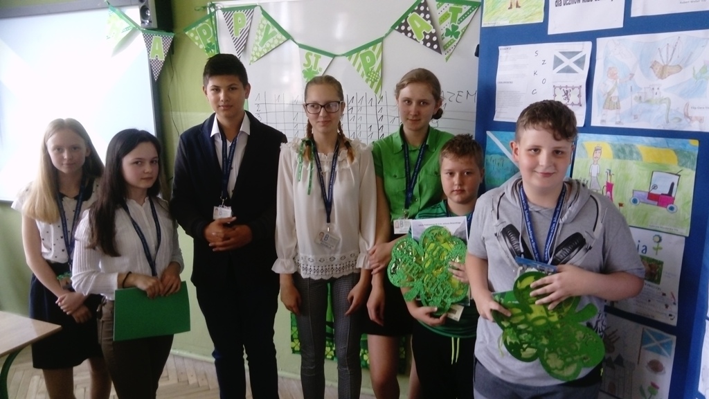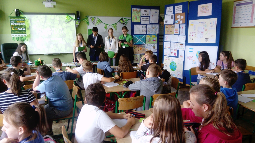 Na czwartoklasistów czekała jeszcze jedna kulturoznawcza niespodzianka przygotowana przez uczniów z klasy 2b gimnazjum, którzy zaprosili uczniów klasy IVa i IVb do udziału w warsztatach kulturoznawczych o Irlandii. Podczas interaktywnej podróży po Irlandii, uczniowie odwiedzili więc Dublin, czyli stolicę Irlandii położoną nad rzeką Liffey. Dowiedzieli się również, gdzie dokładnie leży Irlandia i jak wygląda prawdziwy podręcznik do języka irlandzkiego, z którego uczą się irlandzkie dzieci w szkołach. Zobaczyli irlandzkie godło, czyli złotą harfę ze srebrnymi strunami na niebieskim tle. Każdy czwartoklasista wie już również jakie kolory znajdują się na irlandzkiej fladze. Gimnazjaliści zabrali młodszych kolegów w interaktywną podróż po wybranych atrakcjach turystycznych Irlandii. Zobaczyli więc miejsce słynące z bajkowych krajobrazów i jezior, czyli Park Narodowy Killarney. Kolejne niezwykłe miejsce, które poznali, to Newgrange, czyli grobowiec z kamiennymi korytarzami sprzed ponad 4 tysięcy lat. Odwiedzili również klify Moher, czyli irlandzki cud natury, a także zoo w Dublinie. Zatrzymali się na chwilę w mieście Cork, będącym drugim co do wielkości miastem w Irlandii; jak i również zobaczyli Katedrę Św. Aidana w Enniscorthy i opactwo Kylemore, słynące również z przepięknych ogrodów- Victorian Walled Garden. Dowiedzieli się również kim był Święty Patryk, czyli patron Irlandii i jakie legendy są z nim związane; a także dlaczego koniczynka stała się symbolem Irlandii, a Dzień Świętego Patryka obchodzony jest 17 marca. Poznali także irlandzkie skrzaty, zwane leprechauns. Wiktoria Weber pokazała czwartoklasistom własne zdjęcia zrobione podczas obchodów Dnia Świętego Patryka w Irlandii. Na zakończenie warsztatów, uczniowie wzięli udział w emocjonującym quizie kulturoznawczym. Pracowali w zespołach, w których znaleźli się zupełnie losowo w zależności od numeru znajdującego się na koniczynce wylosowanej tuż przed wejściem do sali lekcyjnej. Na najlepszy zespół czekały oczywiście irlandzkie nagrody. Czwartoklasiści udowodnili, iż byli bardzo uważni podczas irlandzkiej wyprawy i zaskakiwali swoją wiedzą. 10 zespołów walczyło o zwycięstwo udzielając odpowiedzi na pytania. Ostatecznie zwycięzcami Konkursu Wiedzy o Irlandii zostali Aleksander Dudar z klasy IVb oraz Oskar Skoczeń z klasy IVa.