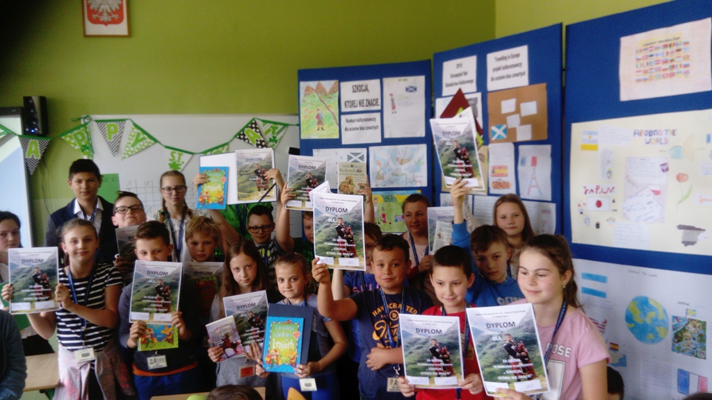 Potem nadeszła pora na konkurs kulturoznawczy dla czwartoklasistów pod hasłem Szkocja- kraj, który nie znacie. Uczniowie z klasy 2b gimnazjum (Wiktoria Weber, Jakub Kotas, Marta Bochniarz, Patrycja Szabla, Marta Pustułka, Monika Grabska) w ramach realizacji założeń projektu edukacyjnego zachęcili uczniów do tworzenia plakatów, które w jak najciekawszy sposób odzwierciedlą różnorodność kulturową i krajobrazową Szkocji. Na specjalnej wystawie na korytarzu szkoły, pojawiły się więc szkockie kilty, legendarny potwór z jeziora Loch Ness, szkockie dudy, zamek w Edynburgu; oset będący symbolem Szkocji, szkocka flaga; haggis, czyli narodowa szkocka potrawa, czy też The Highlands, czyli górzysty region Szkocji. Ostatecznie I miejsce w konkursie zdobyła uczennica klasy IVb- Anna Sztafa. II miejsce przyznano ex aequo Janowi Długoszowi z IVa oraz Klaudii Zielińskiej z IVa. III miejsce zdobyli: Alan Bochenek z IVa oraz Jakub Załubski z IVa. Wśród autorów wyróżnionych prac znaleźli się: Julia Jawor (IVa), Oskar Skoczeń (IVa), Zuzanna Garwol (IVa) oraz Weronika Golonka (IVa). Na laureatów czekały nagrody książkowe oraz pamiątkowe dyplomy, które zaprojektował Jakub Kotas – członek grupy projektowej z 2b. Wszyscy pozostali uczestnicy konkursu otrzymali również pamiątkowe okolicznościowe dyplomy.