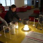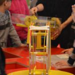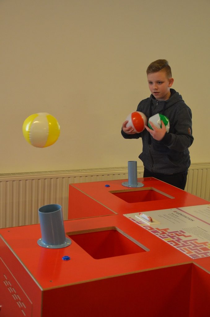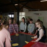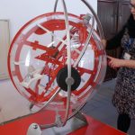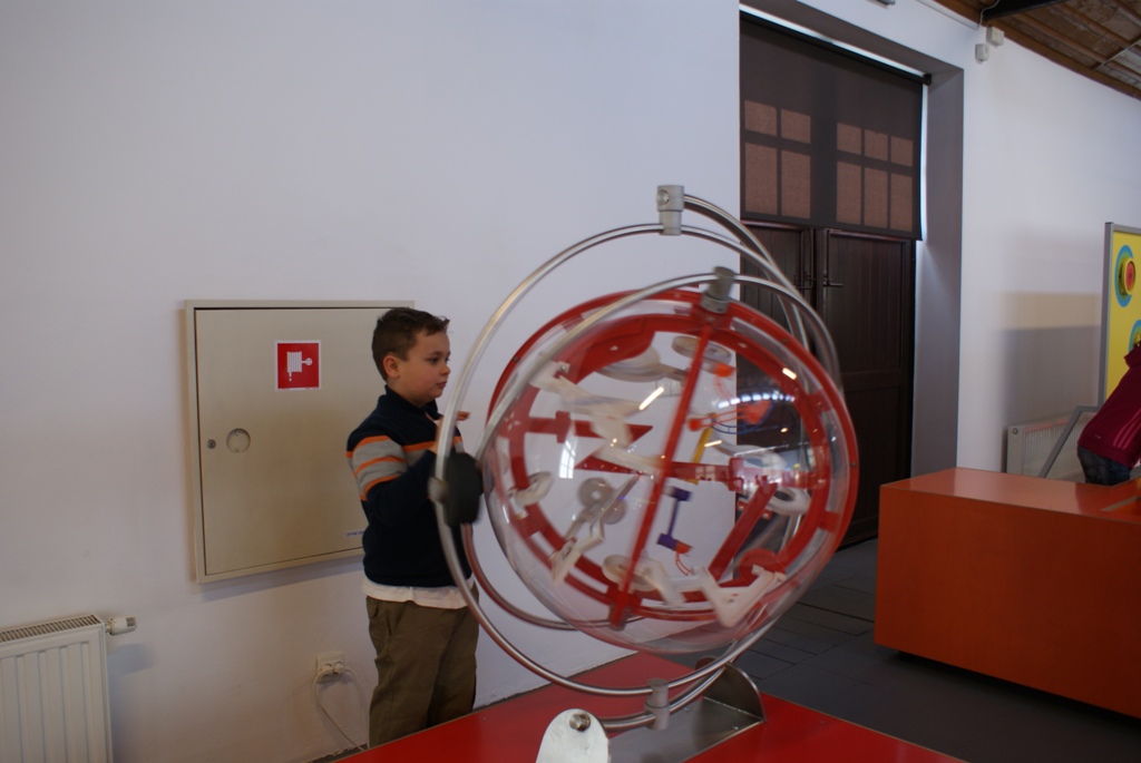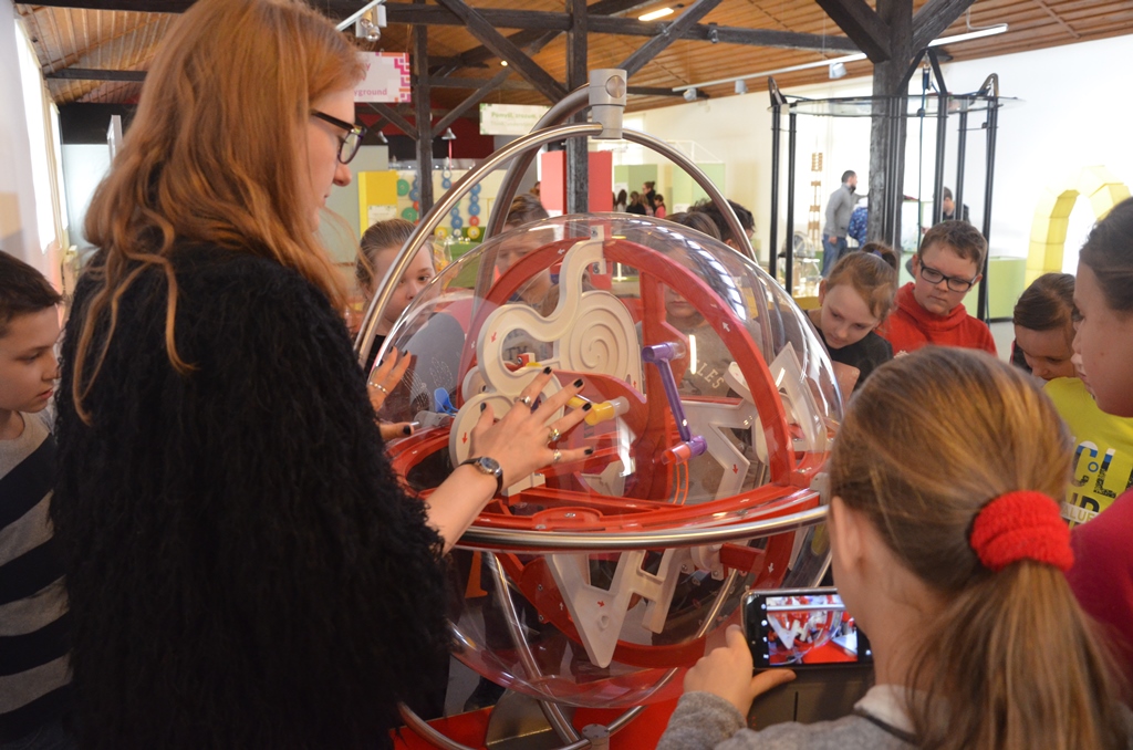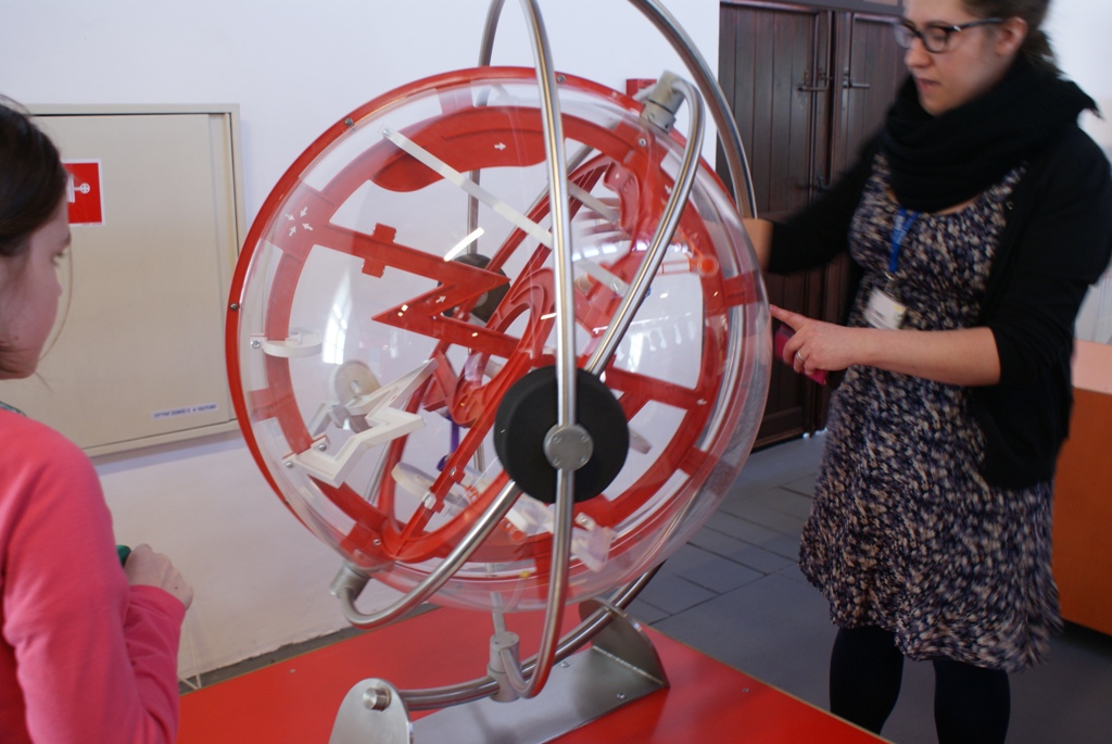 Wystawa „Wokół koła” to był strzał w dziesiątkę. Uczniowie mogli się sporo dowiedzieć o zastosowaniu koła w technice, nauce, przyrodzie, no i oczywiście w codziennym życiu. Na sali zgromadzono około 30 eksponatów, m.in żyroskop służący do pomiaru położenia kątowego, prymitywny pojazd kołowy, koło Leonarda, wielki lejek z obracającym się krążkiem, maszynę z kołami zębatymi, które wprowadza się w ruch i klocki, z których buduje się rotundę.