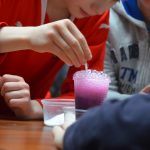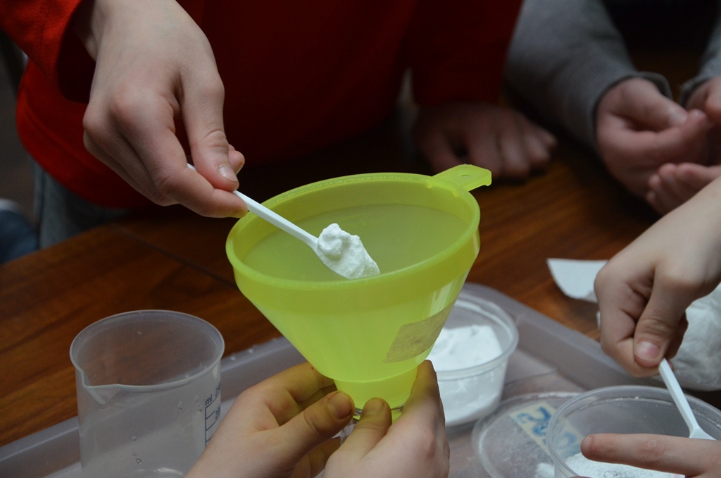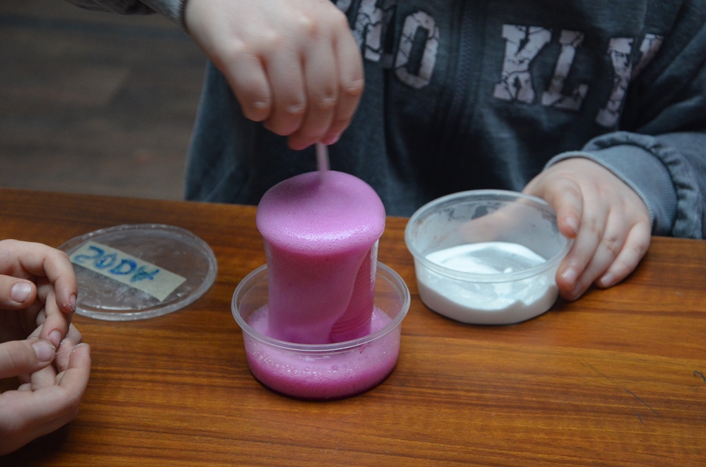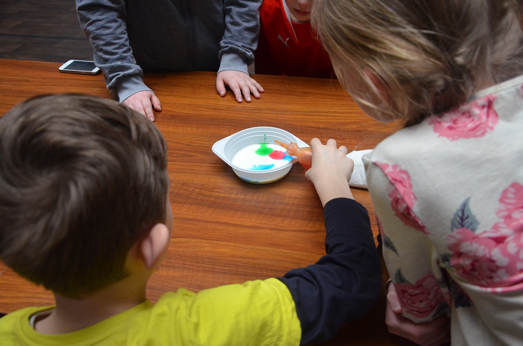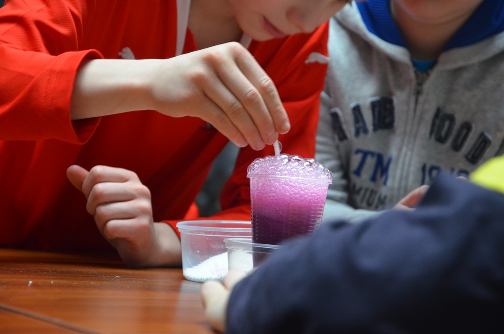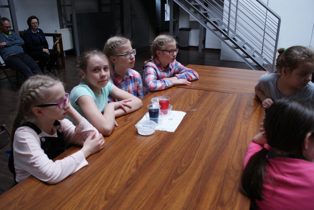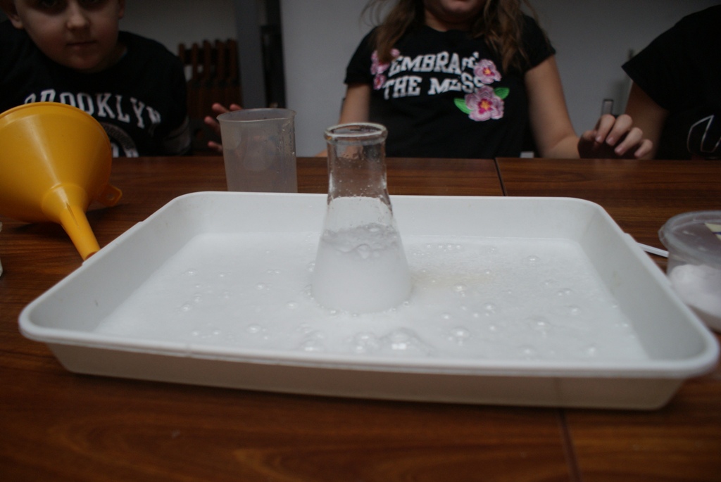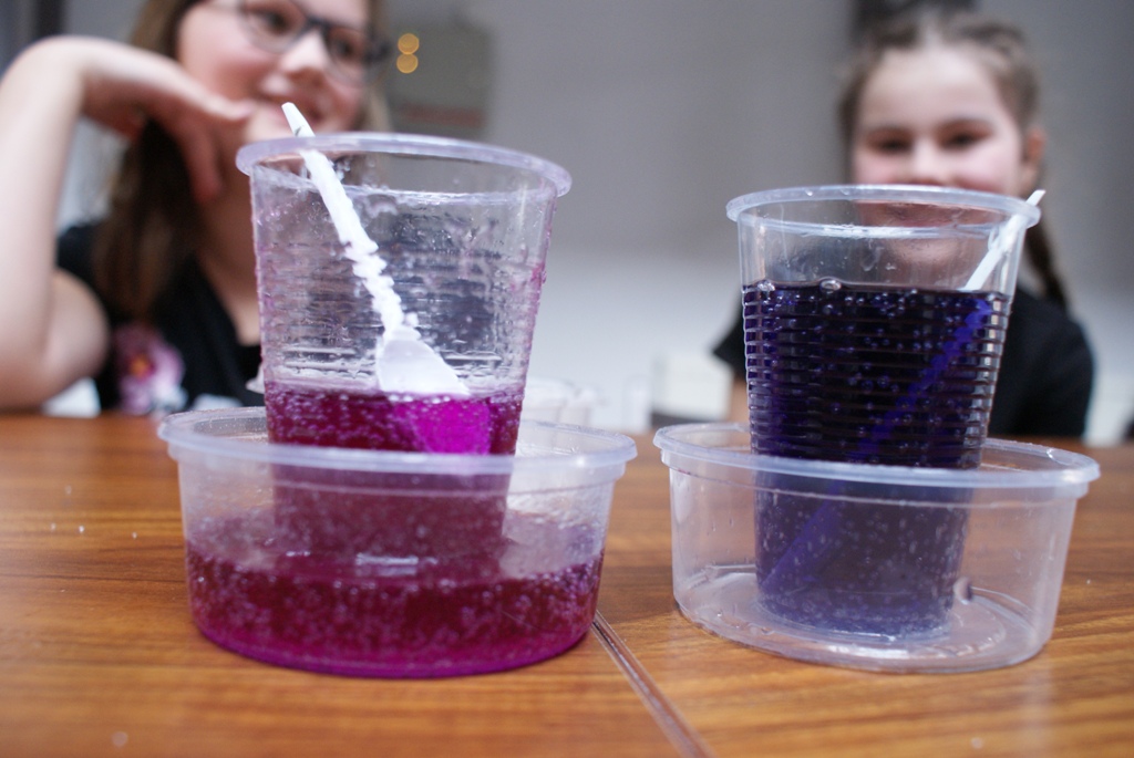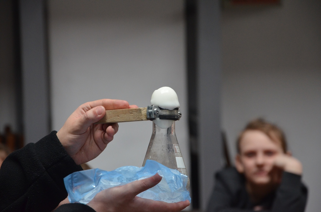Na warsztatach „Magia w kuchni” uczniowie przeprowadzili doświadczenia z różnymi produktami, jakie możemy znaleźć w kuchni. Dowiedzieli się jak zmieścić jajko w butelce z wąską szyjką, sprawdzili jaki kolor ma sok z czerwonej kapusty i co lubią drożdże. Na zakończenie zrobili niegroźny wulkan, korzystając z domowych zapasów.
